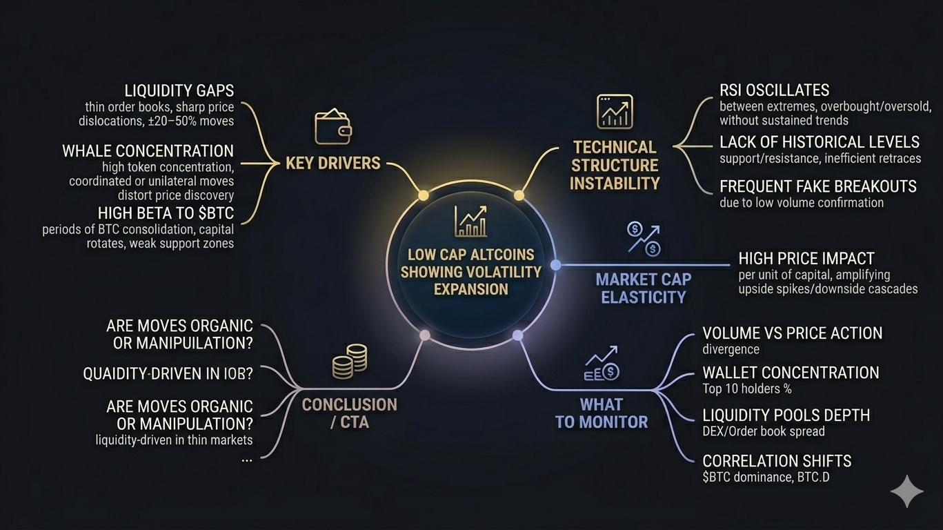 Volatility in low market cap altcoins is currently accelerating due to thin order books and fragmented liquidity, creating conditions for sharp price dislocations.