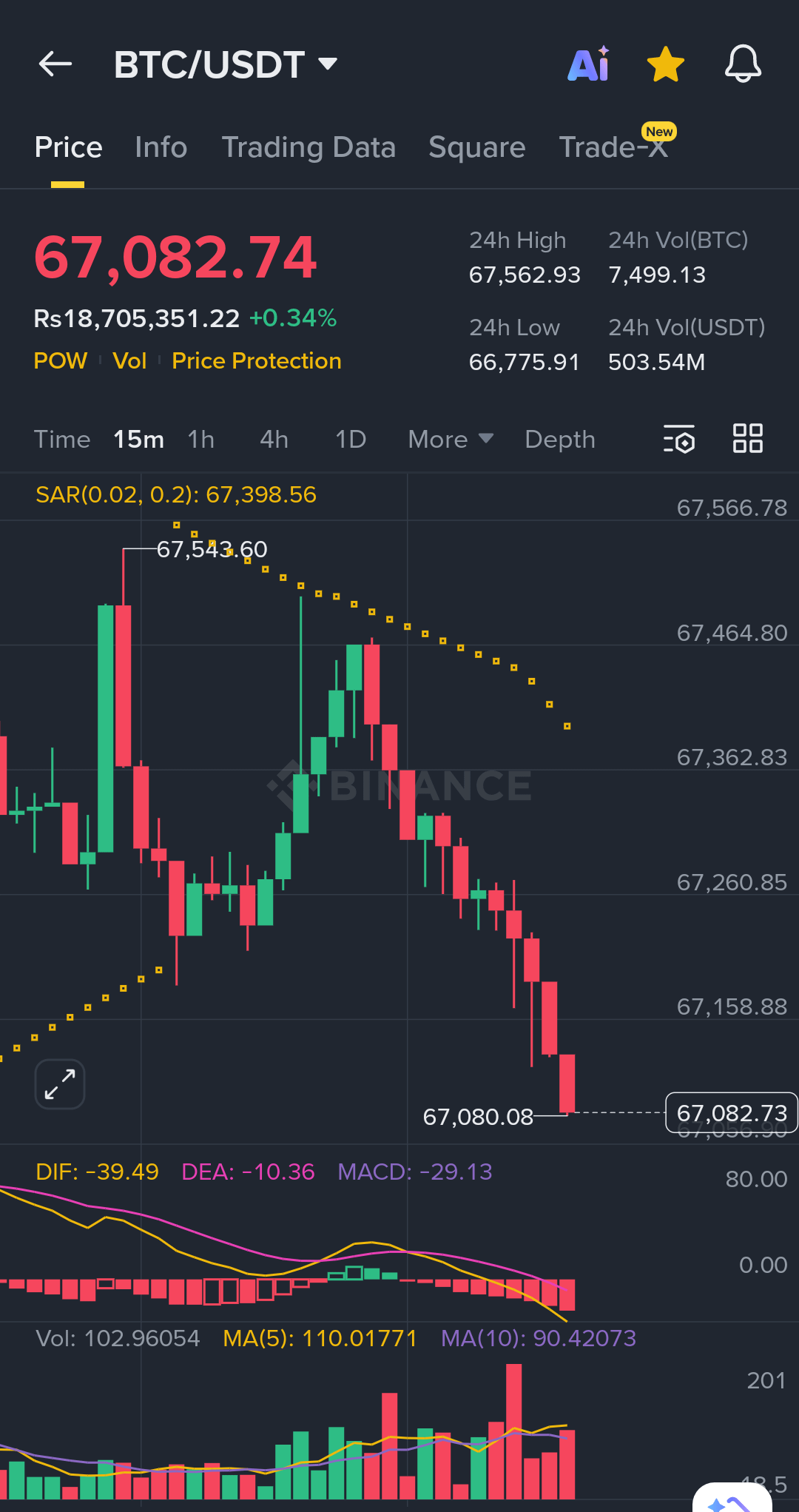 Bitcoin is currently trading at $67,082.74-on the 15-minute timeframe. Over the past 24 hours, BTC has ranged between a high of $67,562.93 and a low of $66,775.91, reflecting moderate volatility. The total 24h volume stands at 7,499.13 BTC (~$503.54M USDT), indicating decent liquidity but no explosive directional commitment.
