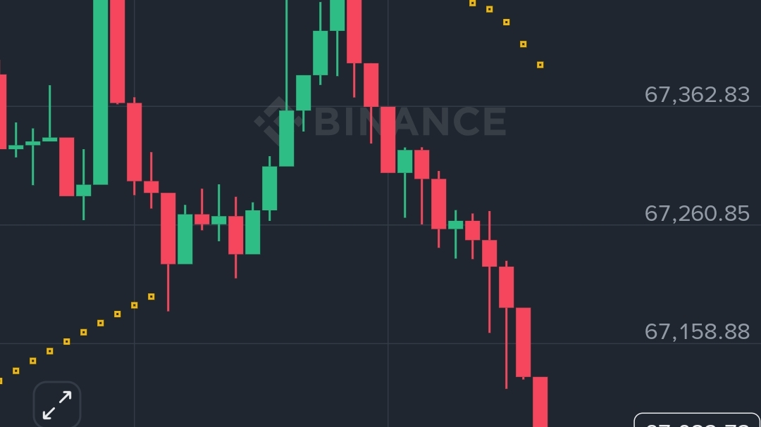 The Parabolic SAR value is 67,398.56, which sits above the current price. This is a classic bearish signal on the selected timeframe, suggesting that the short-term trend has turned downward and that each bounce may face resistance near the SAR level. Traders often treat SAR as a trailing stop – being above price implies selling pressure.