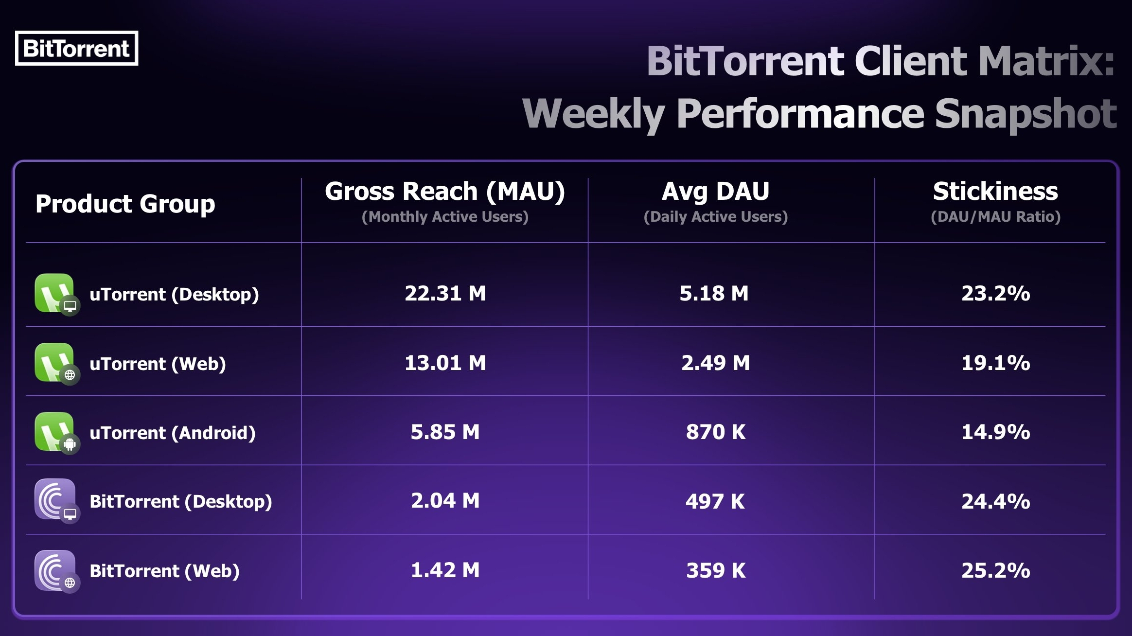 In einem Bereich, in dem die meisten Protokolle Schwierigkeiten haben, Tausende aktiver Benutzer zu onboarden, arbeiten BitTorrent-Produkte bereits in Internetgröße.