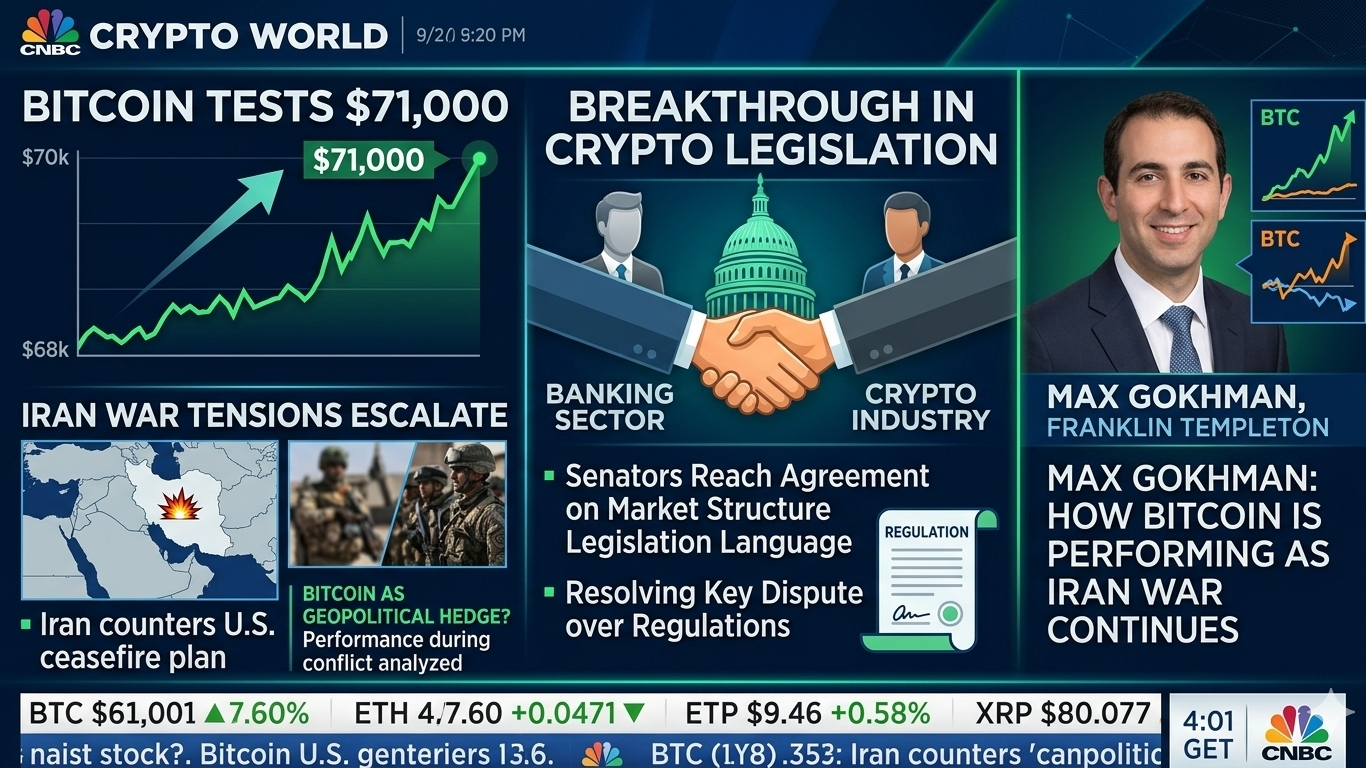 $BTC $XRP On today’s episode of CNBC Crypto World, bitcoin moves towards $71,000 after Iran counters a U.S. ceasefire plan. Also, Senators reportedly reached an agreement on crypto market structure legislation language to settle a dispute between the banking and crypto sectors. Franklin Templeton’s Max Gokhman also discusses how bitcoin is performing as the Iran war continues.