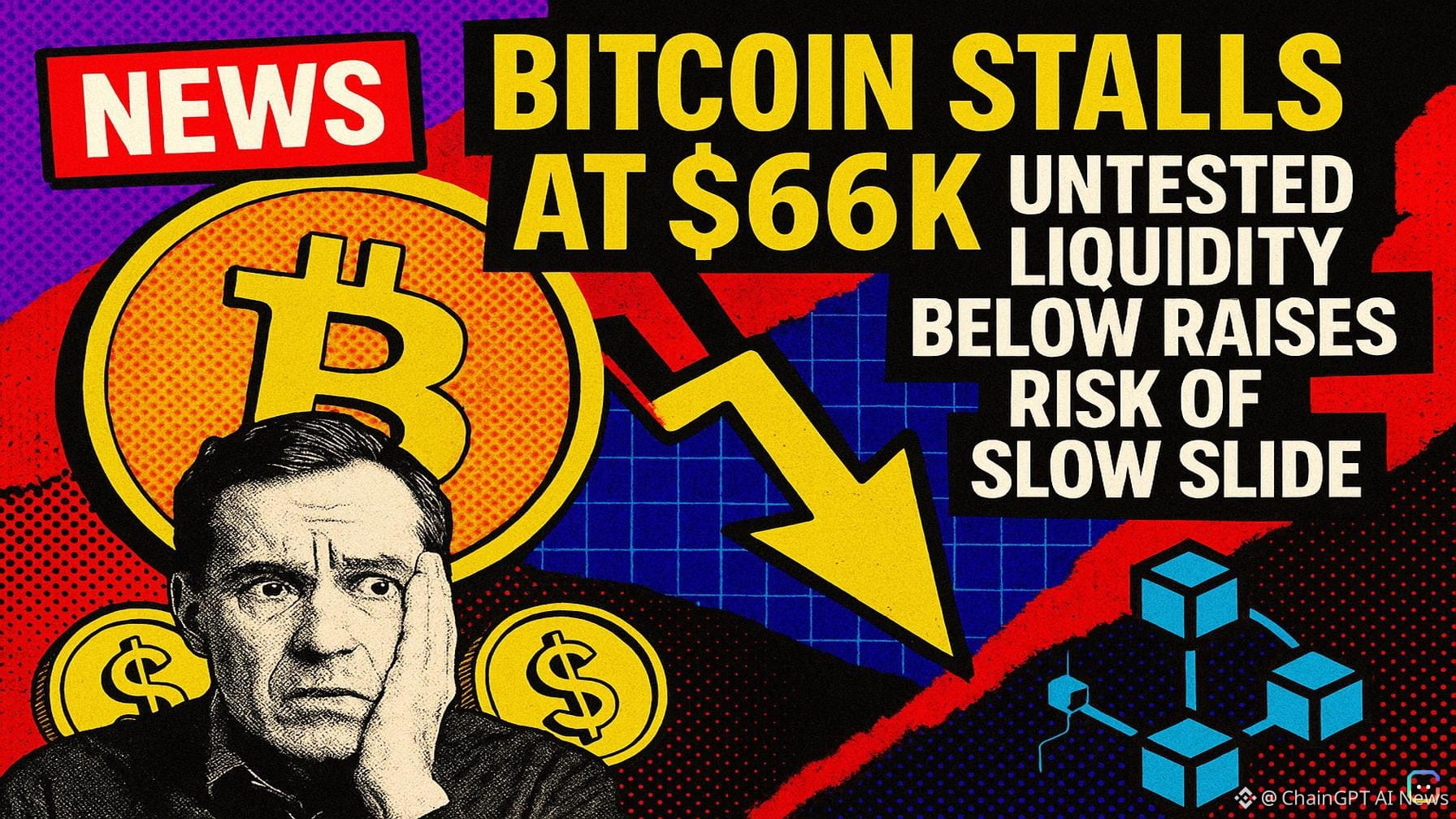 Bitcoin is stalling around $66,000, trading in a tight, choppy range as upward momentum wanes. Every attempt to push higher has produced weaker follow-through, and beneath the surface liquidity appears stacked below current prices — a setup that favors a move lower unless buyers return with conviction. Analyst Columbus, in an update alongside the MMT heatmap, said the market structure hasn’t materially changed: BTC is still chopping around the $66k area. But he flagged a subtle shift — upside reactions are shortening and losing strength — a pattern that often precedes a larger directional expansion once the market decides its next move. Crucially, Columbus notes that liquidity sitting beneath the current price remains untouched. The longer Bitcoin hovers above those zones without clearing them, the greater the risk it will be pulled down to capture that liquidity. While an upside break is still possible, current price action suggests buyers are stepping back and allowing the market to slowly lose ground. Rather than an abrupt crash, Columbus warns the next move could be a gradual drift lower, with Bitcoin sliding into deeper liquidity pockets and setting up a more sustained downside phase. Crypto analyst Cryptomorphic echoes the caution. Over the past day BTC has largely consolidated, hovering inside a narrow range and signaling indecision. While the coin is still holding the lower support of its current structure, repeated tests without strong bounces are showing emerging weakness. If that support breaks, targeting liquidity below could trigger a sharp downside move as momentum accelerates in the absence of robust buying interest. Given how pivotal this area is, how price reacts here will be critical — either a temporary hold or confirmation of a deeper breakdown. Key takeaways: - BTC is stuck around $66,000 with fading upside momentum. - Liquidity sits under current prices and remains untested — a potential magnet for price. - Analysts warn of a slow drift lower into deeper liquidity, though an upside breakout is still possible. - Watch price behavior at the lower support level: a breakdown could spark a faster decline. Read more AI-generated news on: undefined/news