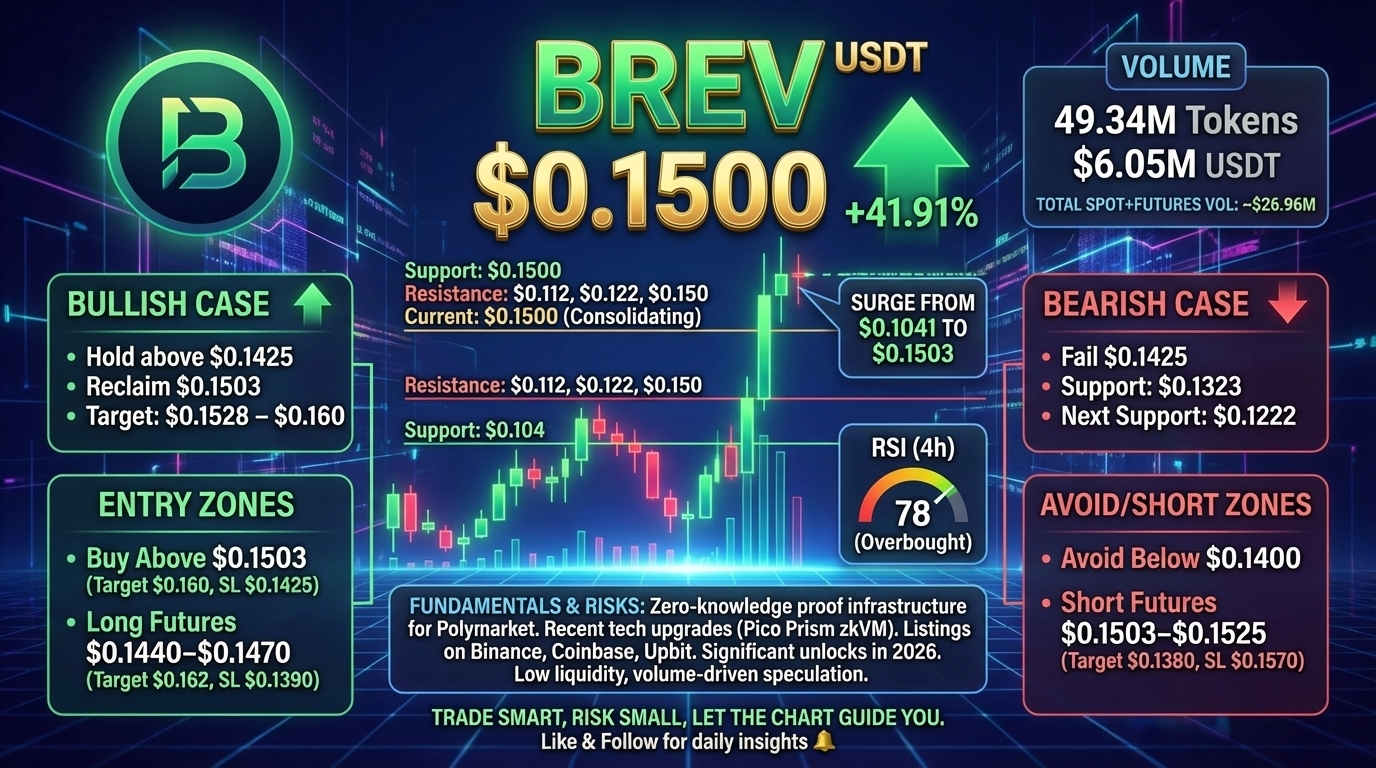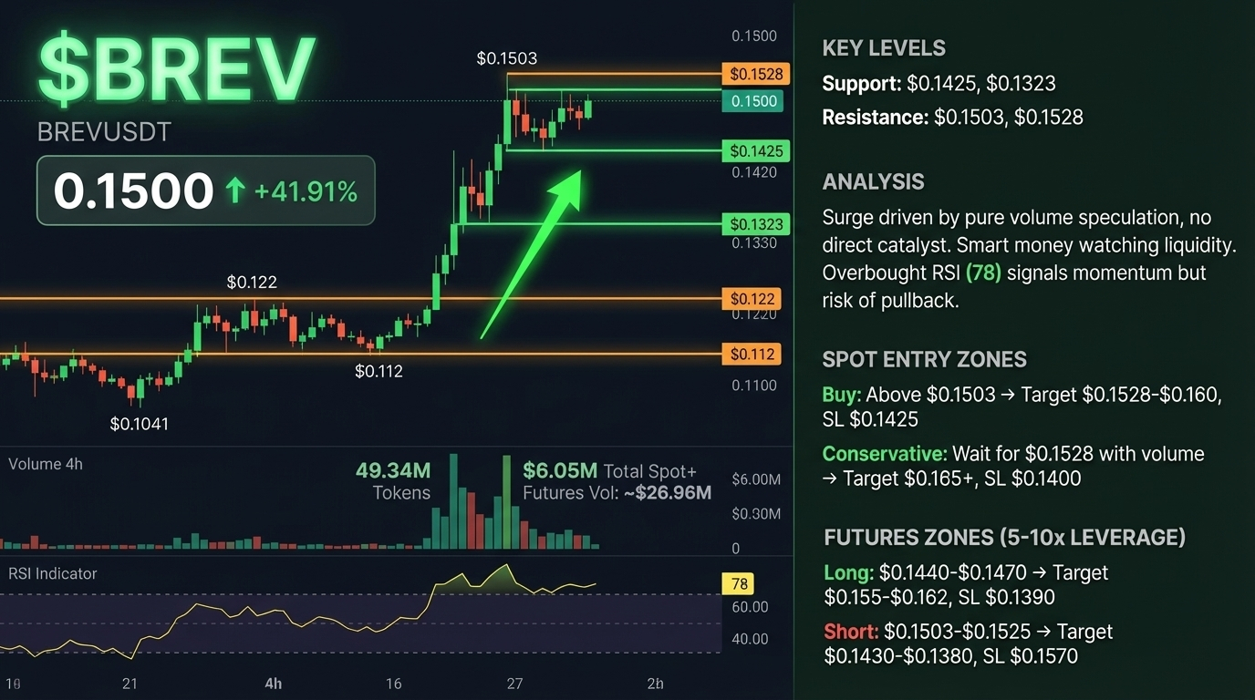 $BREV just surged 41%, climbing from $0.1041 to $0.1503, now consolidating at $0.1500. 📈 Volume hit 49.34M tokens with $6.05M USDT changing hands, while total spot+futures volume reached ~$26.96M. The move has no direct catalyst — no official announcements, major news, or whale transfers. Just pure volume-driven speculation. Smart money is watching liquidity. The crowd is chasing the spike. 👀