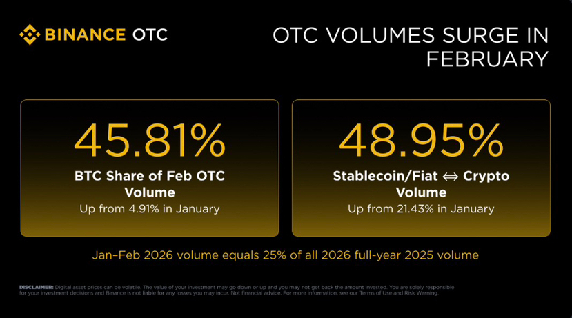🪙BTC’s OTC share jumped from 4.91% in January to 45.81% in February, as the $60,000 level attracts smart entry into spot BTC.