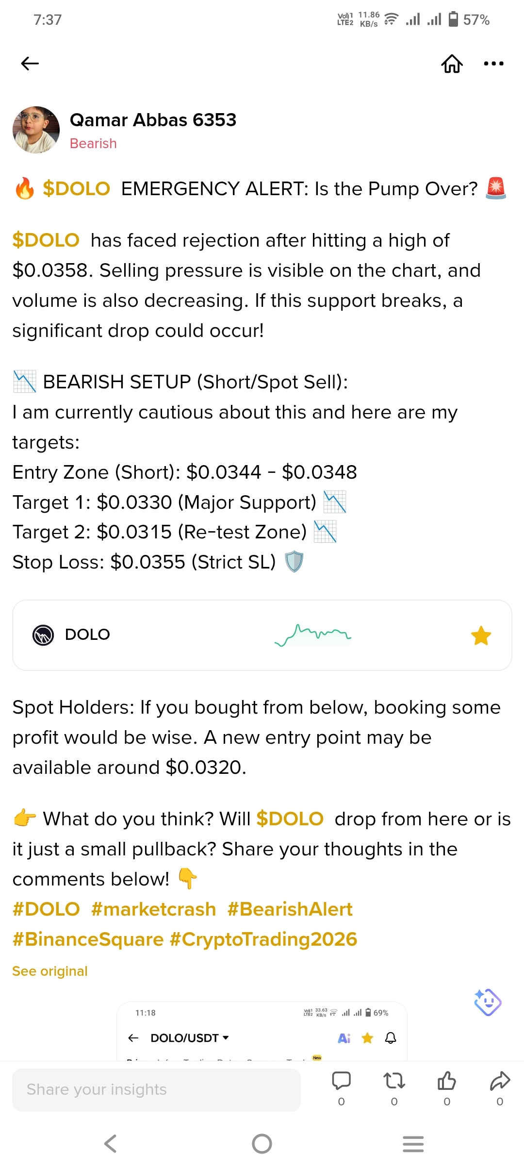 Kal jab sab Bullish thay, maine kaha tha ke $DOLO niche ayega. Dekh lein results aapke samne hain! 🎯