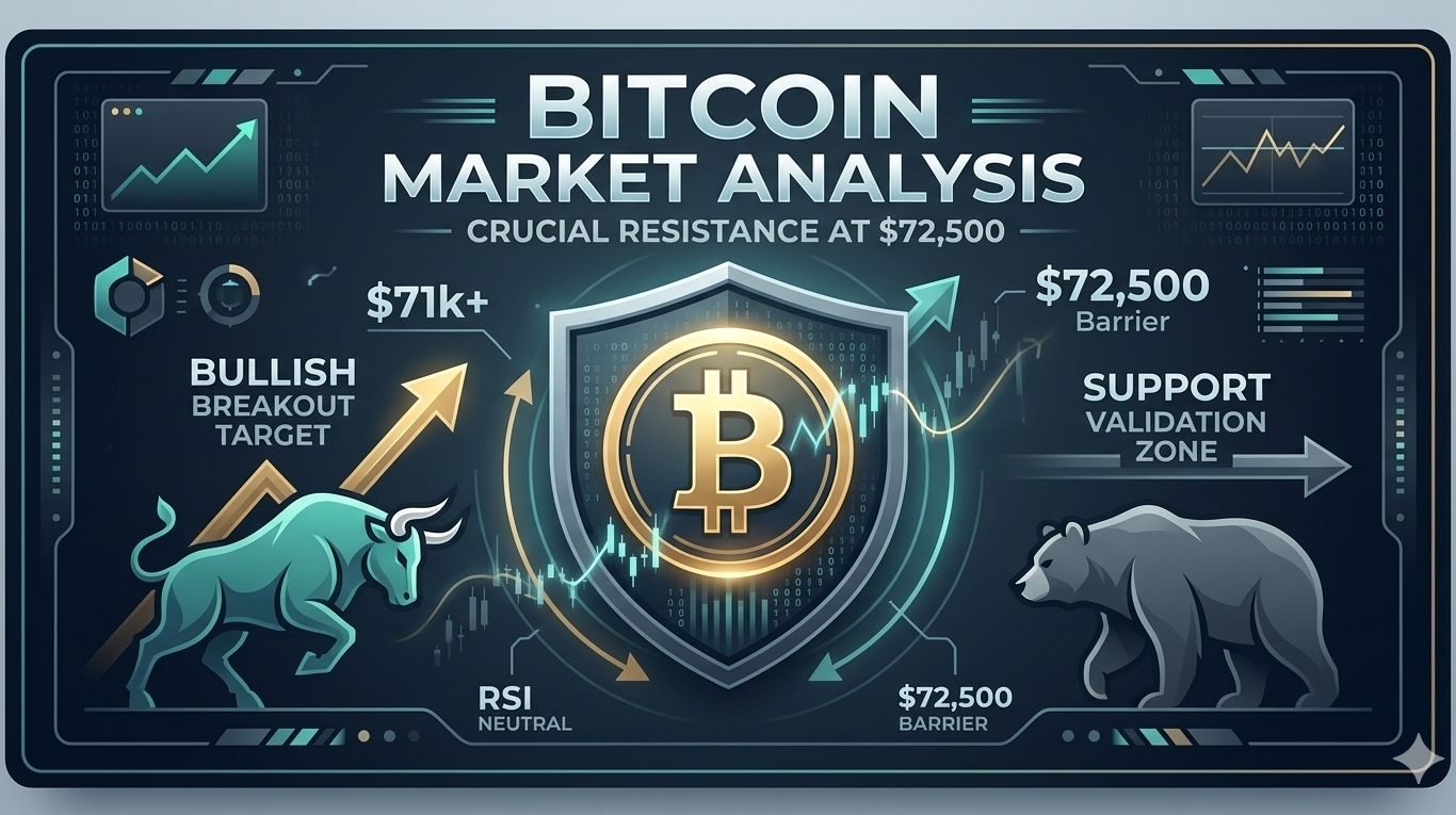 Failure to break $72,500 could lead to a short-term correction. If the support at $71,000 cracks, the next major support zone to watch would be around $69,800 to $70,000. Holding this level is crucial to maintaining the overall bullish structure.
