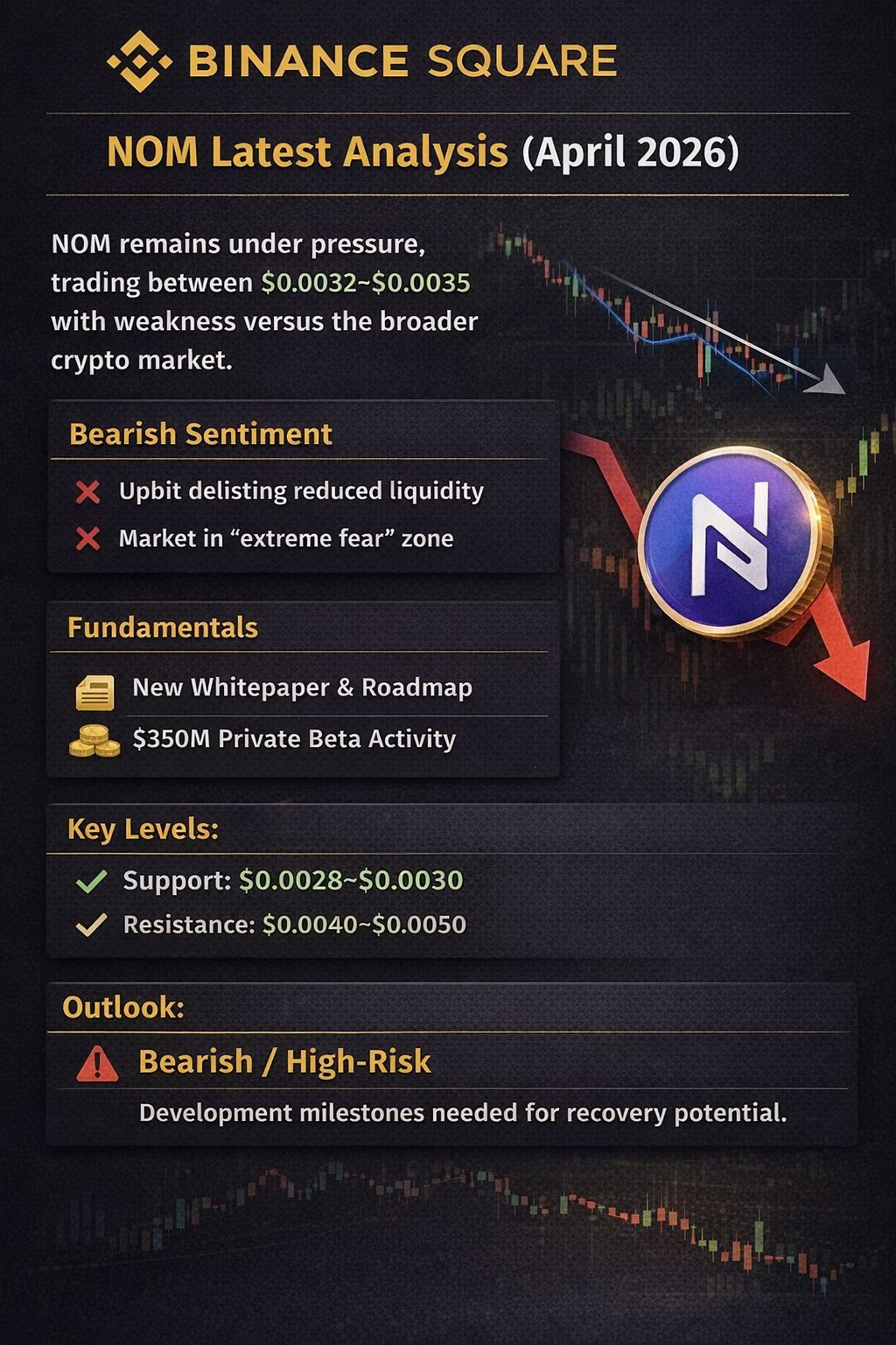 $NOM remains under pressure, currently trading around the $0.0032–$0.0035 range, with recent price action showing weakness and underperformance versus the broader crypto market. �