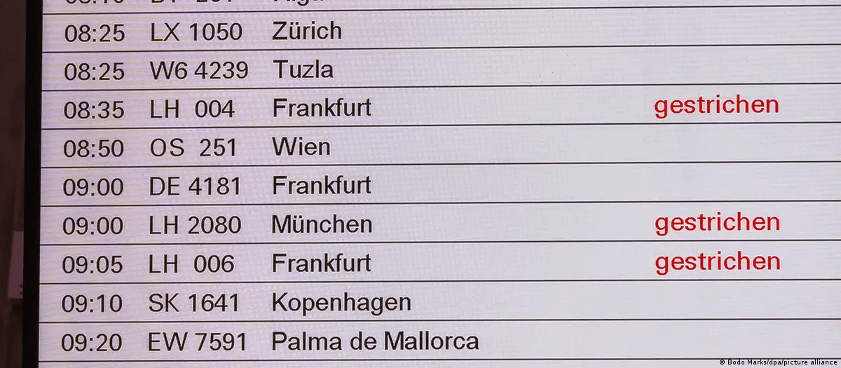 Am Flughafen Frankfurt am Main wurden etwa 75% der fast 350 geplanten Abflüge von Lufthansa gestrichen. Auch an den Flughäfen Hamburg und Berlin werden Dutzende von Flügen nicht durchgeführt.