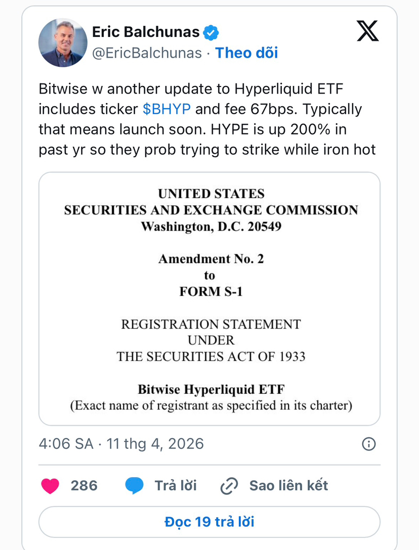Bitwise Asset Management đang tiến gần hơn tới việc ra mắt quỹ ETF Hyperliquid giao ngay, sau khi nộp bản sửa đổi lần hai lên Ủy ban Chứng khoán và Giao dịch Mỹ (SEC) — một động thái thường được xem là bước hoàn thiện cuối trước khi sản phẩm chính thức lên sàn.