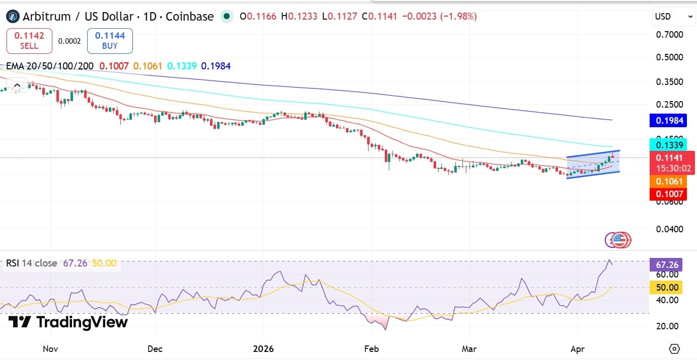Tại thời điểm viết bài, ARB đang được giao dịch ở mức 0,1146 USD, tăng 7,5% trong ngày. Chuyển động này đã giúp giá vượt lên trên các đường trung bình động 20 ngày và 50 ngày. Khối lượng giao dịch cũng tăng 44% lên mức 181 triệu USD, cho thấy sự tham gia mạnh mẽ hơn từ thị trường.
