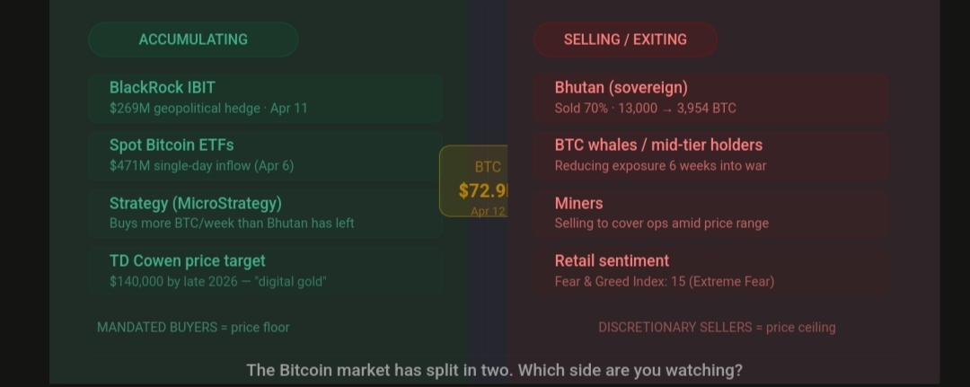 Six weeks of war. Six weeks of fear. And the Bitcoin market has revealed something important about how it actually works now.Bitcoin's price has stayed in a relatively tight range around $65,000 to $73,000 during six weeks of war, but that stability masks a market increasingly dependent on a small group of mandated institutional buyers. Strategy, US spot Bitcoin ETFs, and a few other institutional channels now provide most of the sustained buying, while whales, mid-tier holders, miners, and even Bhutan's sovereign holdings have been selling or sharply slowing accumulation.