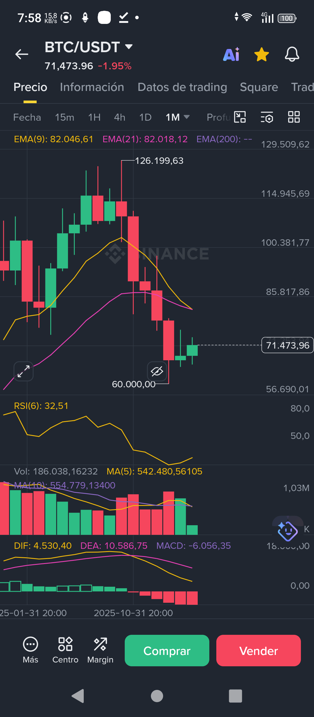 RSI Mensual (32.51): Esto es vital. A nivel mensual, Bitcoin está "frío". Tenemos un espacio de subida brutal antes de que el mercado se sobrecaliente. Las ballenas saben esto y por eso están defendiendo los $71k en el diario.