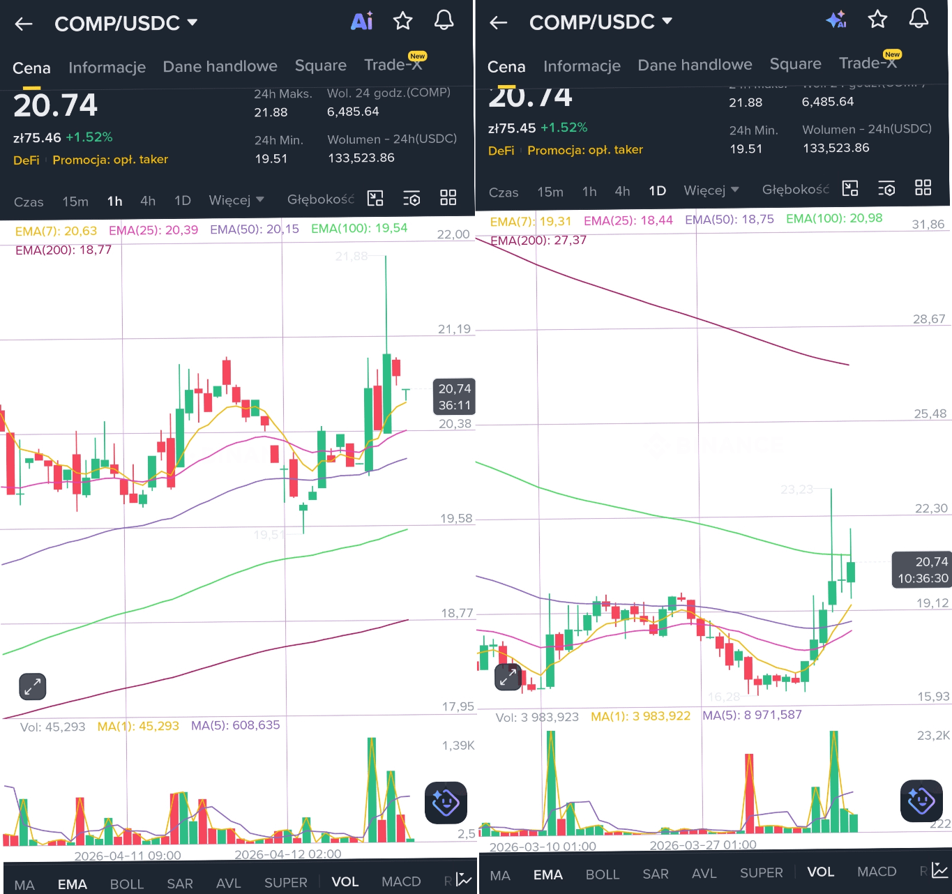 Na interwale dziennym trend spadkowy jest wyraźny. Cena COMP/USDC znajduje się poniżej wszystkich kluczowych średnich kroczących (EMA 7, 25, 50, 100, 200). EMA 200 (ok. 27.37) jest bardzo daleko, co wskazuje na siłę niedźwiedzi. Aktualny poziom cenowy 20.74 testuje od dołu EMA 100 (ok. 20.98), która działa jako silny opór dynamiczny. Formacje świecowe (w tym wick oznaczony 23.23) pokazują, że próby wybicia w górę są szybko kontrowane przez podaż. Wolumen na 1D nie wykazuje obecnie silnego potwierdzenia powrotu do trendu wzrostowego.