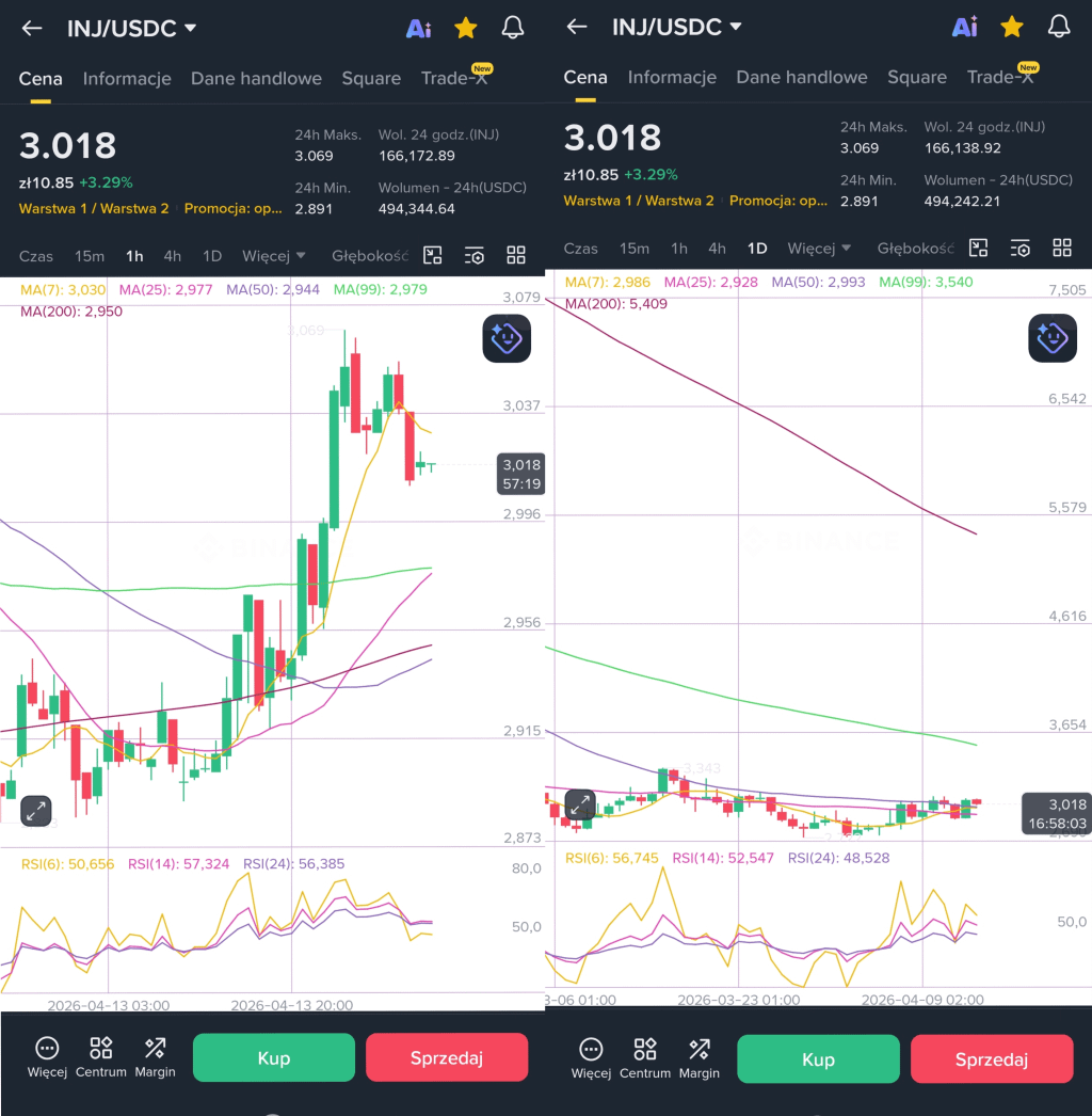 Sytuacja na parze $INJ /USDC staje się kluczowa. Po dynamicznych wzrostach na interwale 1h, cena dotarła do oporu w rejonie 3.069, wyznaczonego przez lokalne szczyty i presję podaży. Obecnie obserwujemy testowanie poziomu 3.018, gdzie silny popyt stara się utrzymać cenę powyżej psychologicznej bariery 3.00. Sentyment na rynku jest mieszany, z lekką przewagą byków na niższym interwale, ale z ostrożnością na wyższym (1D), gdzie cena zbliża się do istotnych długoterminowych średnich kroczących.