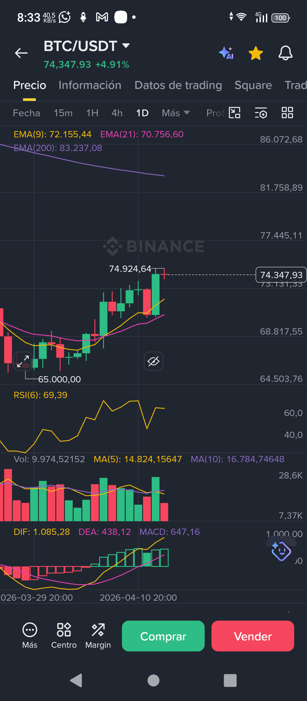 Miren la captura de hoy (8:33 AM). Bitcoin ha lanzado una vela verde masiva que nos lleva a los $74,340.50.