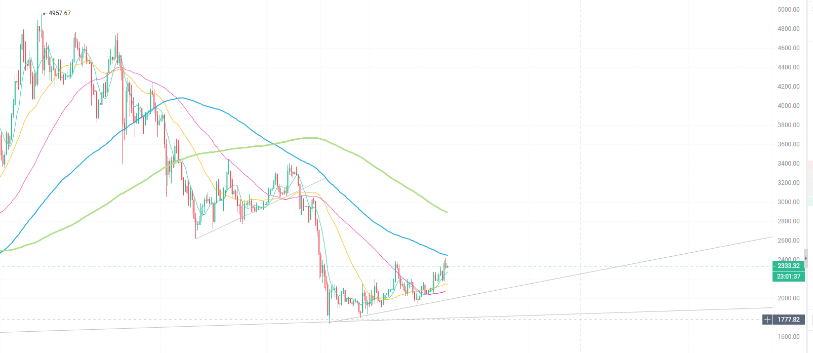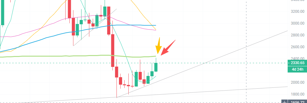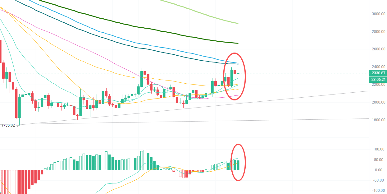 2400被放量突破说明资金在轮动,但周线均线还在上方压制——这是一场多空拉锯战,还没到决战时刻。周线站上2505美元之前,这笔反弹定性为"结构性修复",不是趋势反转。最好的做法是等回踩EMA20(2200美元)企稳后再入场,而不是现在追涨。