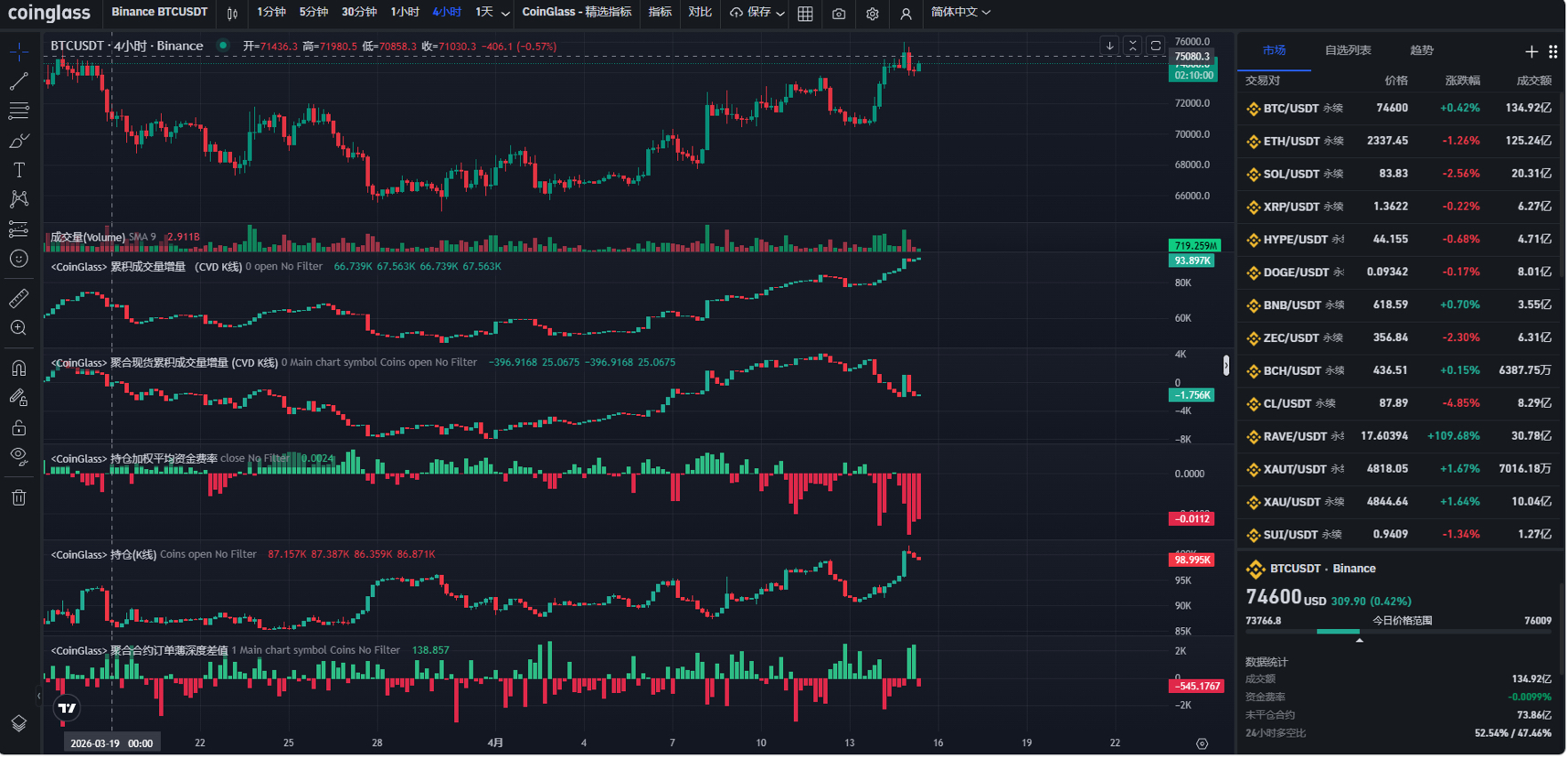 比特币昨晚上涨至3月17日高点76000附近试探高位承压