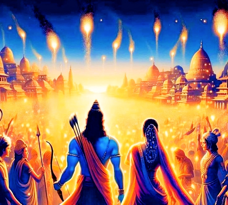 Die Rückkehr von Lord Rama in sein Königreich Ayodhya, nachdem er den Dämonenkönig Ravana besiegt und seine 14 Jahre Exil vollendet hat.