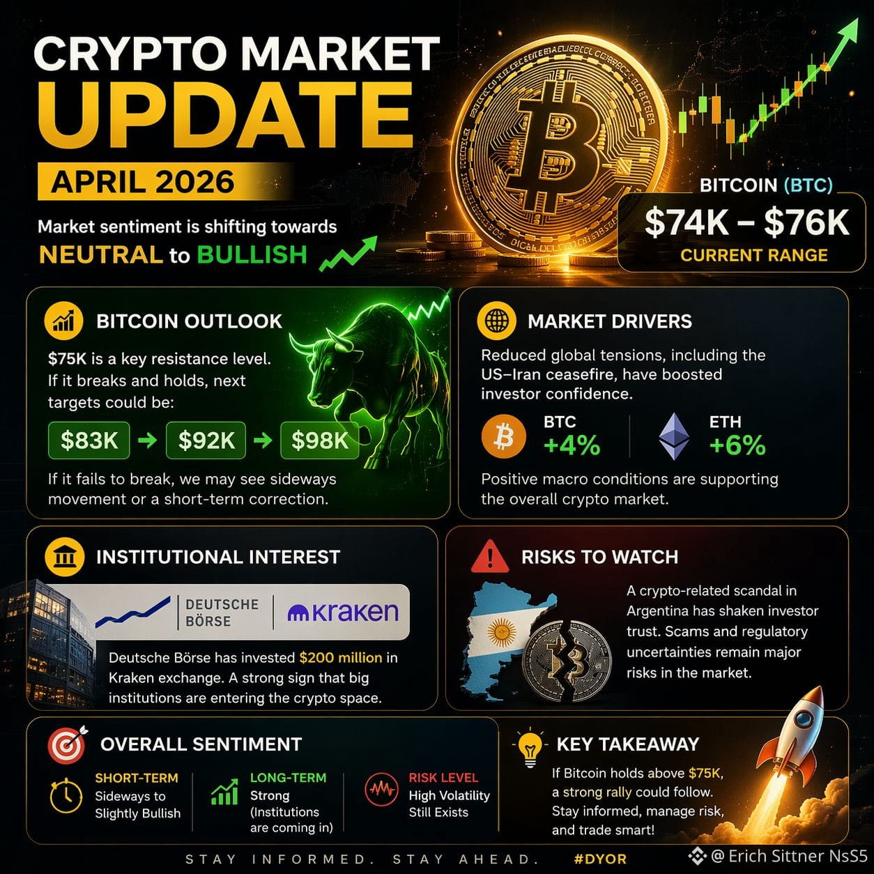 The crypto market is showing some interesting movement today. Bitcoin has made a strong recovery and is currently trading around the $74K–$76K range. Overall sentiment is gradually shifting from bearish to neutral, and now leaning toward bullish.