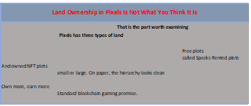 Pixels has three types of land. Free plots, called Specks. Rented plots. And owned NFT plots — small or large. On paper, the hierarchy looks clean. Own more, earn more. Standard blockchain gaming promise.