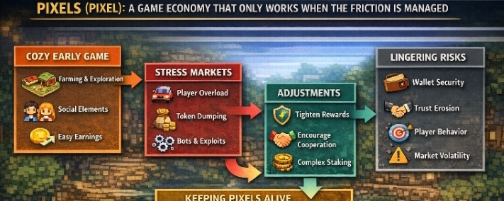 Pixels tries to counter that by shifting rewards toward more meaningful activity. Not just mindless farming, but cooperation, contribution, maybe even strategy. That sounds good. It probably is good. But it also introduces friction. And friction is tricky. Too little, and people exploit the system. Too much, and people just stop playing.