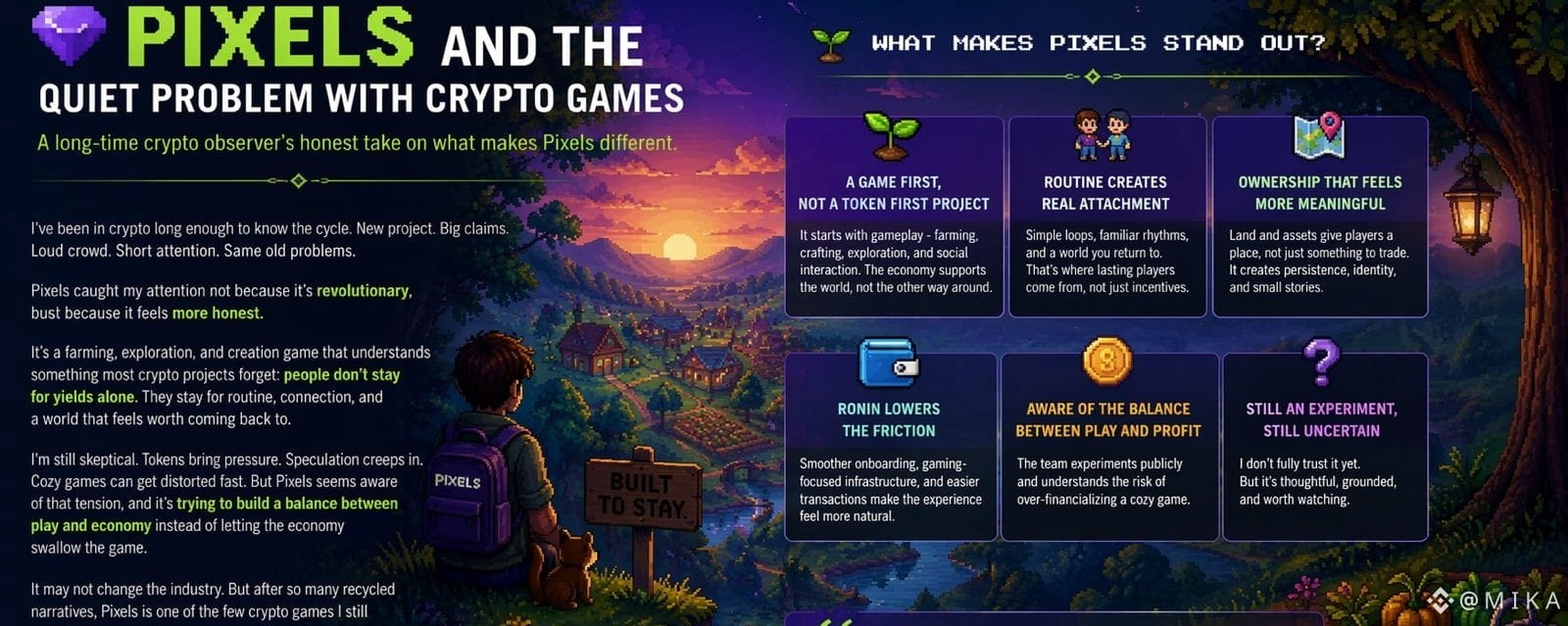 That’s probably why I’ve become slower to react. I don’t get excited that easily anymore. I’ve seen too many projects confuse noise for traction and too many communities mistake motion for meaning. So when I say Pixels caught my attention, I don’t mean I think it’s the future. I just mean it made me pause, which already puts it ahead of most things in this market.