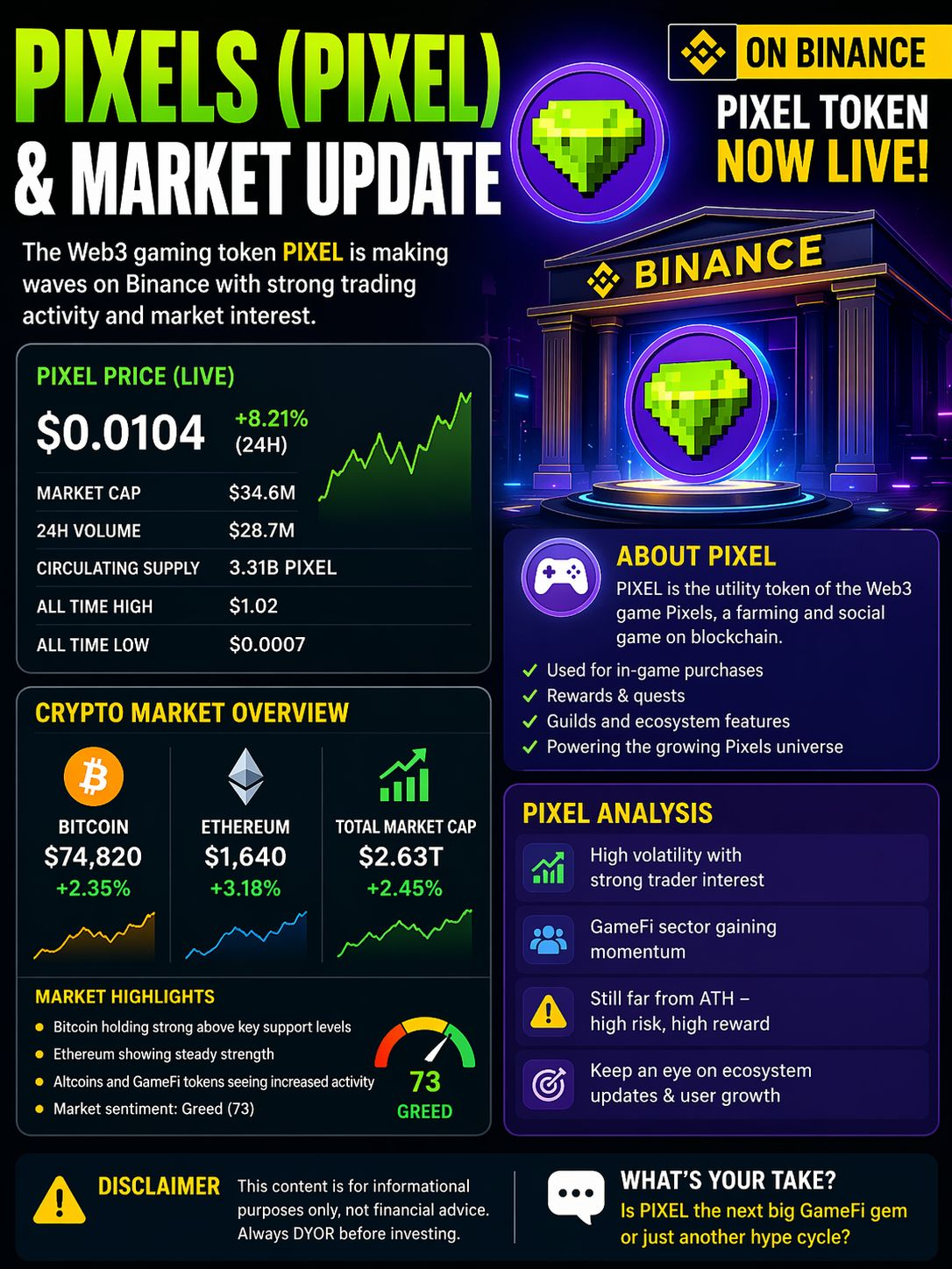 The Web3 gaming token Pixels (PIXEL) continues to attract attention after its strong presence on major exchanges like Binance, with traders closely watching its volatility and ecosystem growth.