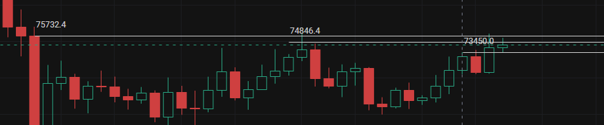 Die erste Unterstützung unten bei 73800 wurde nicht durchbrochen~~ Der Rückprall auf der 1-Stunden-Nullachse~~