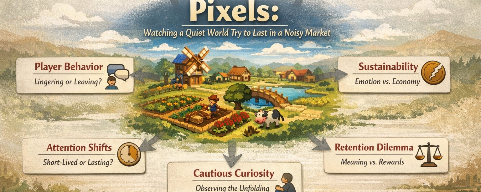 I find myself paying attention to smaller signals now. Not announcements or promises, but behavior. Do people return without being reminded? Do they talk about their time there in a way that feels personal, not transactional? These things are harder to measure, but they tell a more honest story. Pixels shows glimpses of that kind of connection, but it’s still fragile. It could grow into something meaningful, or it could dissolve as soon as the conditions change.