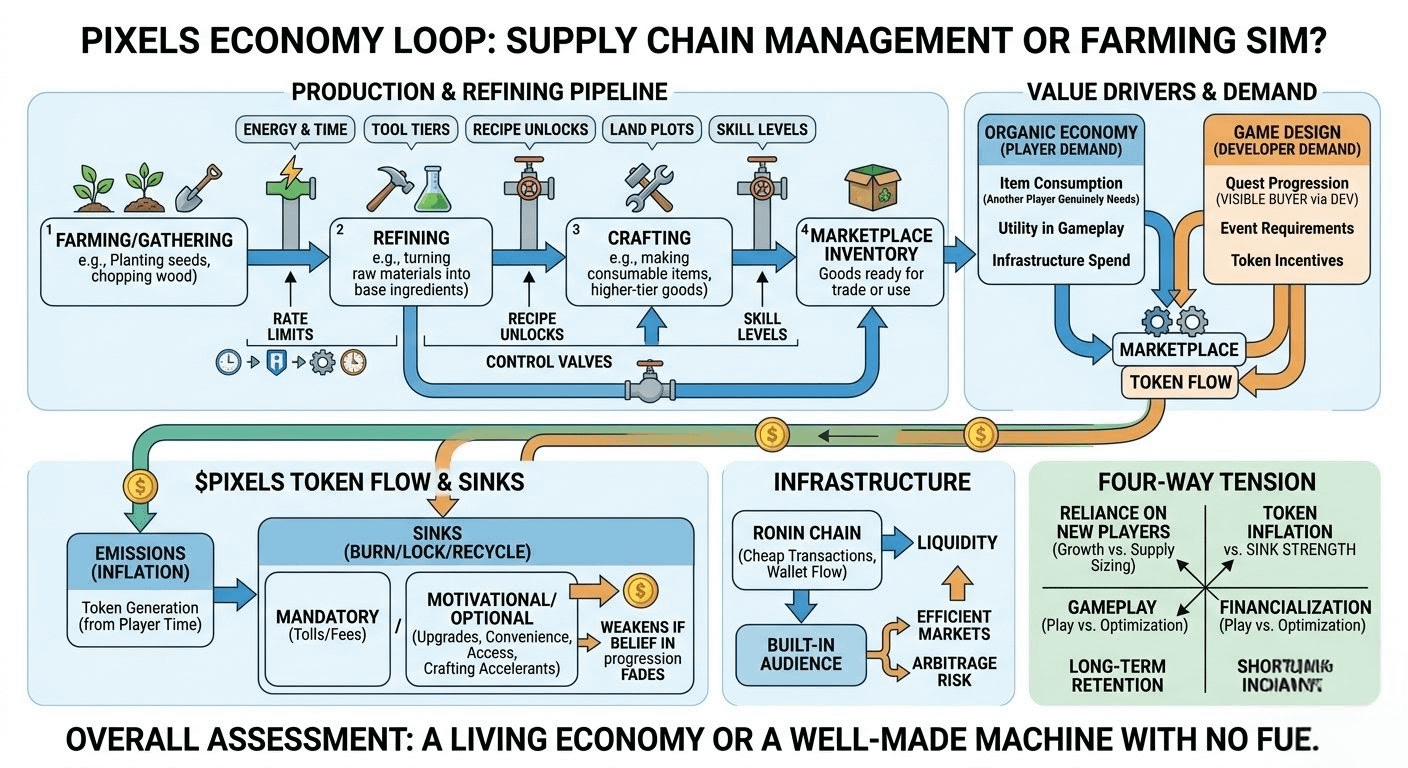 most people talk about pixels like it’s just a cute farm sim where you earn $pixels for doing chores. plant stuff, harvest, craft, sell, repeat. that’s the surface narrative and it’s not wrong, but it misses the real thing i keep noticing: the game is basically a set of throttles and conversion steps designed to turn player time into tradeable outputs, without letting the outputs spiral out of control.