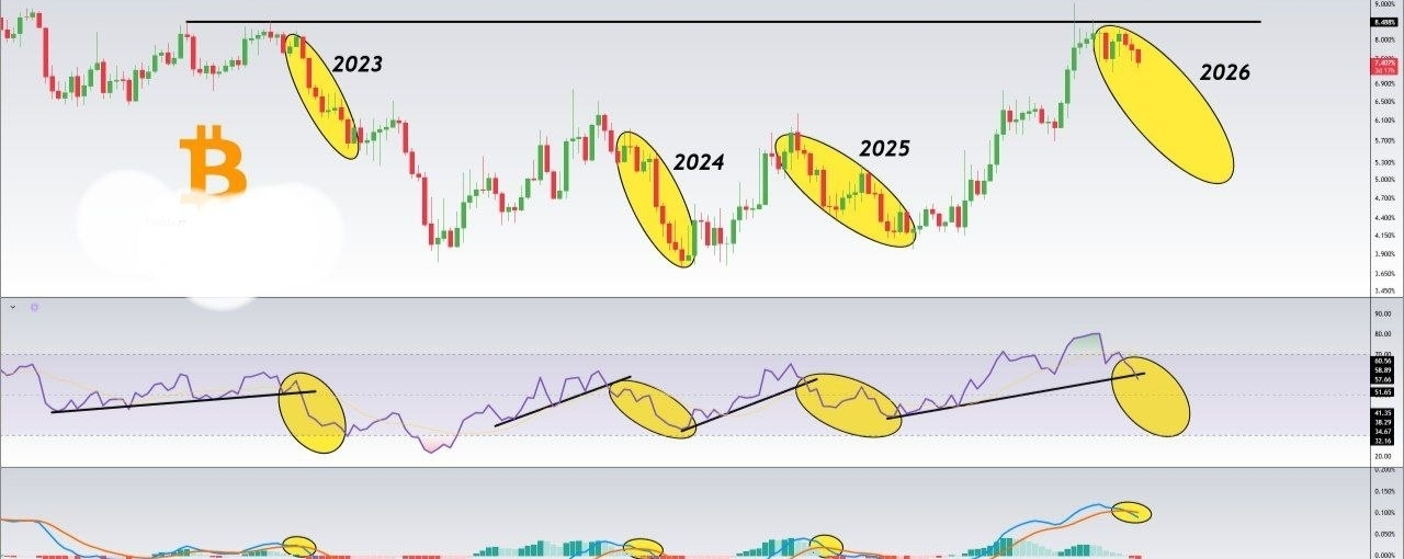 Look at the structure in your chart. Every year follows the same rhythm, but never in a way that feels obvious while you’re inside it. Price pushes up, people get louder, timelines fill with conviction—and then something subtle shifts. Not price. Not yet. Just momentum.