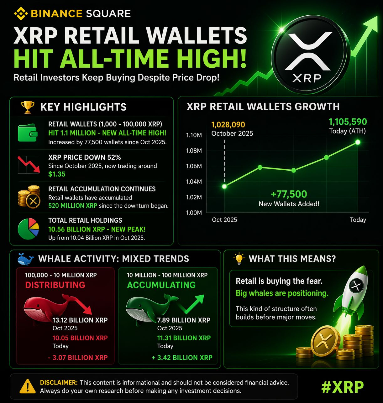 $BTC The number of XRP wallets holding between 1,000 and 100,000 tokens has climbed to 1.1 million, marking a new historical peak.