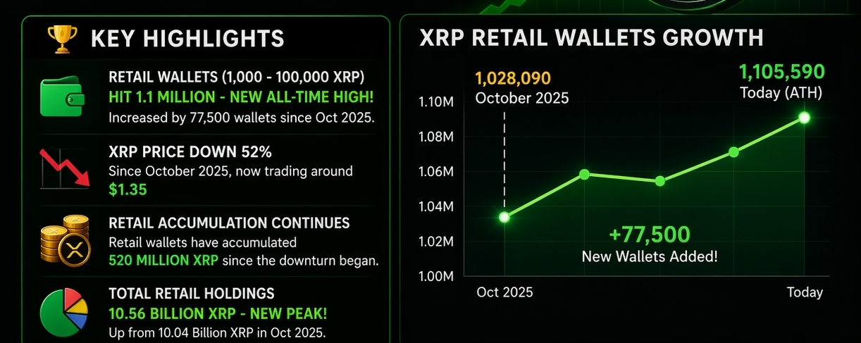 These retail wallets have now climbed to 1.1 million, a new peak in XRP’s history.$BTC