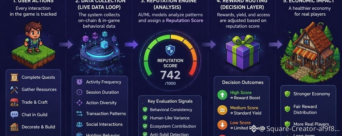 This data loop directly dictates how rewards are distributed. High reputation players gain access to better resource pools and actual yield, while suspected bot farms get silently nerfed out of the economy. I’ll admit, building a flawless behavioral algorithm is incredibly difficult, and there’s always an inherent risk of accidentally penalizing a real player who just happens to have a very repetitive farming style. It is definitely an ongoing cat and mouse game between the developers and bot farm operators, and it remains to be seen how well this holds up as the network continues to scale.