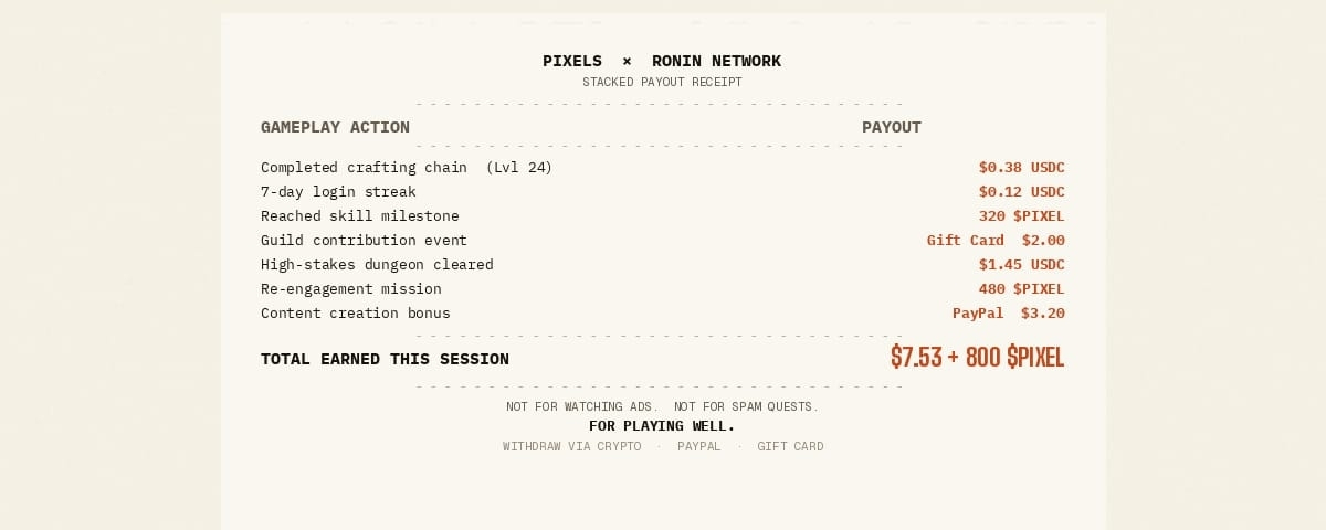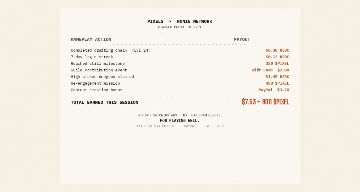 This matters for what you can do with what you earn. Stacked supports withdrawals through crypto, PayPal, and gift cards. That range is deliberate. Not everyone who plays Pixels wants to navigate a crypto wallet or understand exchange rates. Some players just want to see a real number in a payment platform they already use. The ability to withdraw to PayPal treats the reward like what it actually is: money you earned by doing something that had value inside a real economy. A gift card is something you spend in the physical world. These exit paths are not an afterthought. They are a recognition that the player base for games like Pixels is not all crypto natives, and that the reward loses meaning if the person earning it cannot access it in a way that feels normal to them.