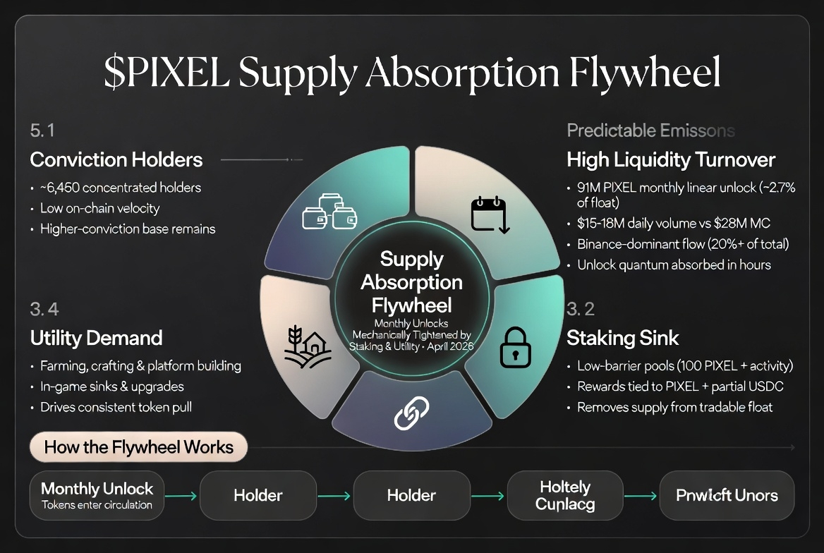 I've been sitting with this one for a couple of weeks now, watching the charts, checking the Ronin explorer, and actually playing the game a bit more than usual. What started as casual curiosity has turned into a pretty firm view on $PIXEL that feels different from the usual noise you hear in crypto circles. Most folks still see it as that pixel art farming game that had its moment back in '24 and has been grinding lower ever since. Fair enough on the surface. But the part that keeps me coming back and the reason I'm more constructive here than I've been in months is a quiet mechanical reality that's playing out in the token itself, almost in the background. The monthly unlocks aren't creating the selling pressure everyone assumes they will. Instead, they're getting absorbed faster than the market seems to realize, thanks to staking mechanics that are actually working in practice. It's not hype. It's just supply tightening in a way the price hasn't fully reflected yet.