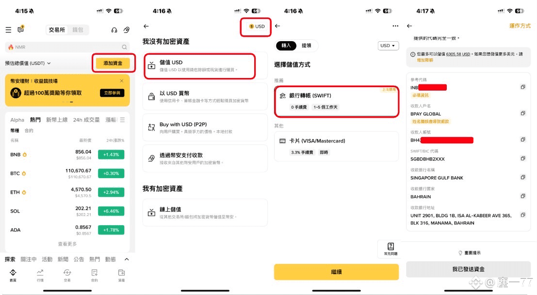 幣安APP入口:首頁選擇添加資金 ➝ 右上角切換成USD ➝ 儲值USD ➝ 銀行轉帳 ➝ 獲得你專屬的銀行轉帳資訊