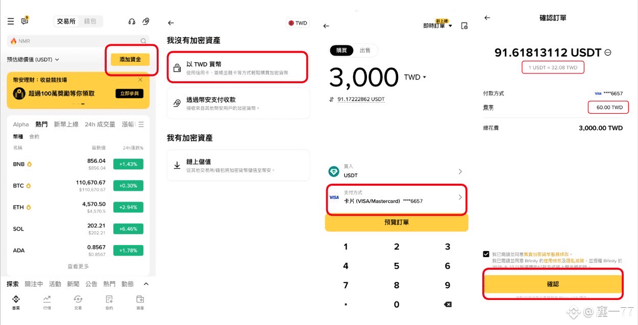 APP入口:首頁選擇添加資金 ➝ 以TWD買幣 ➝ 支付方式選擇綁定信用卡或Apple/Google Pay ➝ 輸入你想要買入的金額和加密貨幣即可。