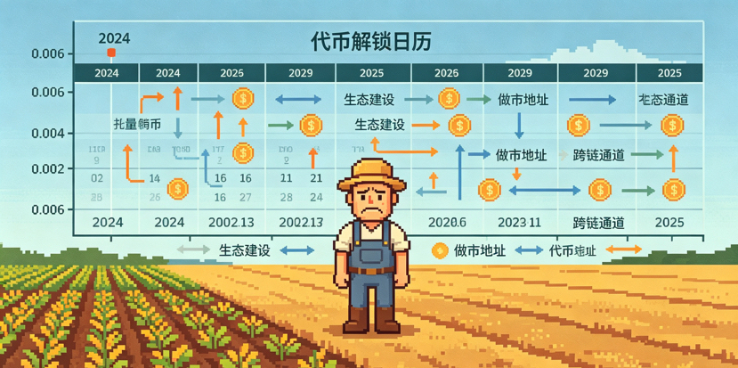 项目方在做事,只是市场没在看。Pixels的代币总量50亿枚,目前只解锁了约7.7亿枚,占15.42%。这个解锁日历一直排到2029年,顾问4月19日解了一轮,下一个节点是5月19日,约9118万枚解锁,占当前流通量的11.83%,值大概470万美元。每月都有筹码按点出来,质押池吸收体量有限,价格想抬头确实难。