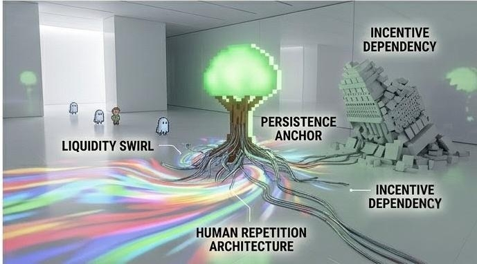 If persistence becomes the product, then what exactly is being built? A world people inhabit, or a dataset of behavioral continuity waiting to be monetized later in ways we don’t fully see yet? Crypto has a habit of turning participation into abstraction over time, even when it starts with seemingly harmless loops.