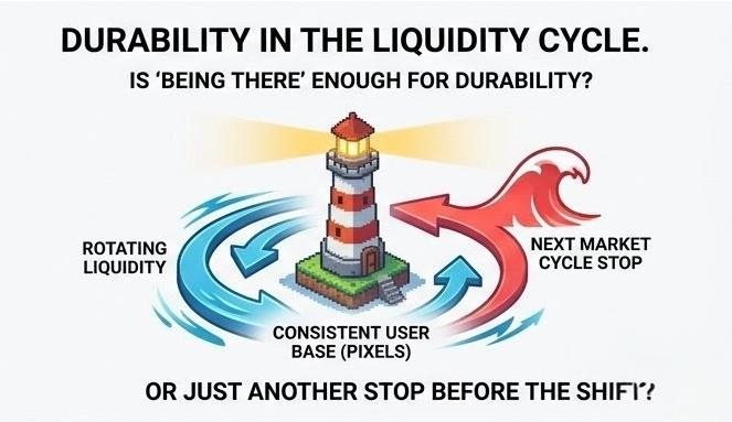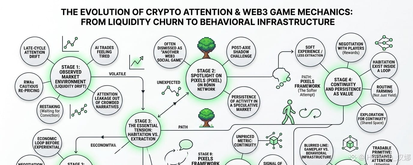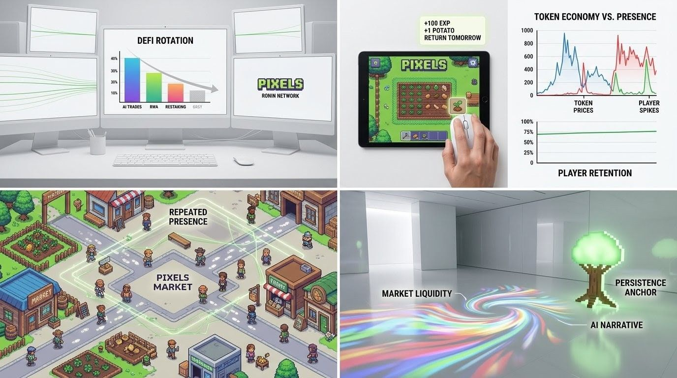 In this market, liquidity moves like weather. It rotates faster than narratives can stabilize. One week it’s modular blockchains, the next it’s AI agents, then it’s RWAs again when macro conditions tighten and everyone starts craving “real yield” language. Within that cycle churn, most projects are optimized for attention capture, not attention retention. Pixels feels like it is trying intentionally or not to anchor itself on the latter.