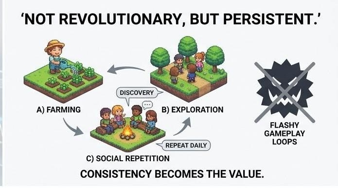 At first glance, it’s easy to dismiss it as another social Web3 game. Farming, exploration, creation the familiar vocabulary we’ve seen recycled across cycles. But the interesting part isn’t the genre. It’s the persistence of activity in a market that usually abandons anything that doesn’t immediately reflect in liquidity or speculation velocity.