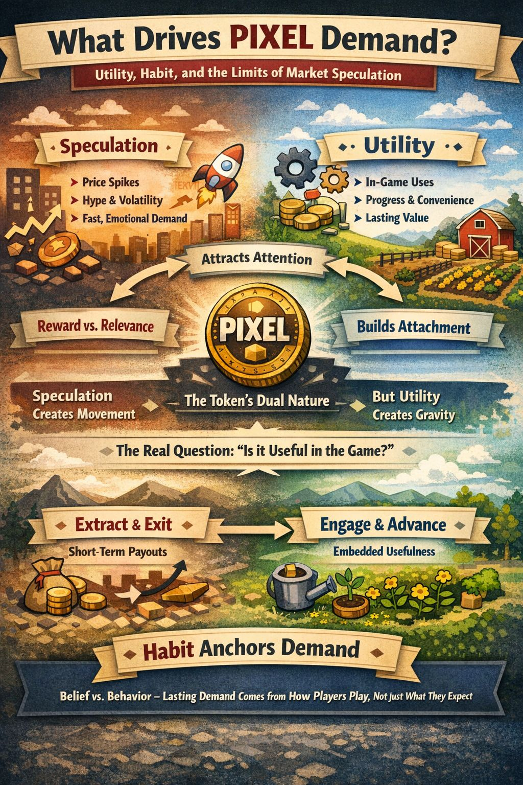 Speculative demand is the easiest kind of demand to notice because it announces itself immediately. It shows up in volatility, breakout narratives, social media attention, and renewed market interest. It is the force that can reprice a token quickly, especially when sentiment shifts or a broader gaming narrative returns. In the case of PIXEL, speculation has clearly been part of the story. That is normal. Any token with enough visibility, liquidity, and community presence will attract traders looking for upside, rotation, or momentum. In crypto, attention itself is often treated like value.