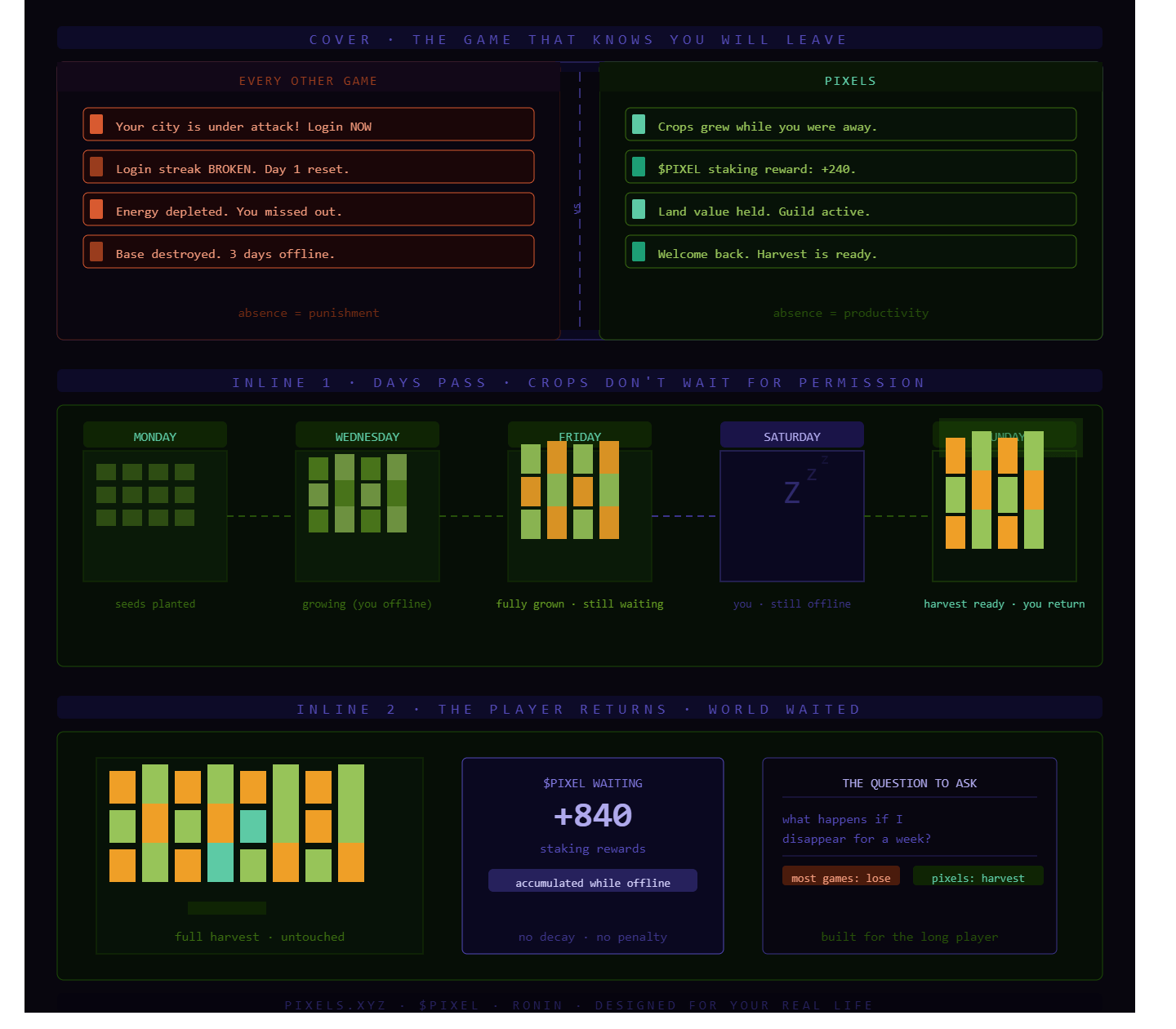 This isn’t just a nice mechanic. It’s a whole different way of thinking. Most games see time away as a problem to fix. Pixels sees it as a normal rhythm and builds around it.