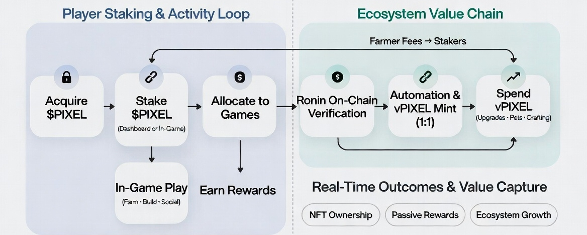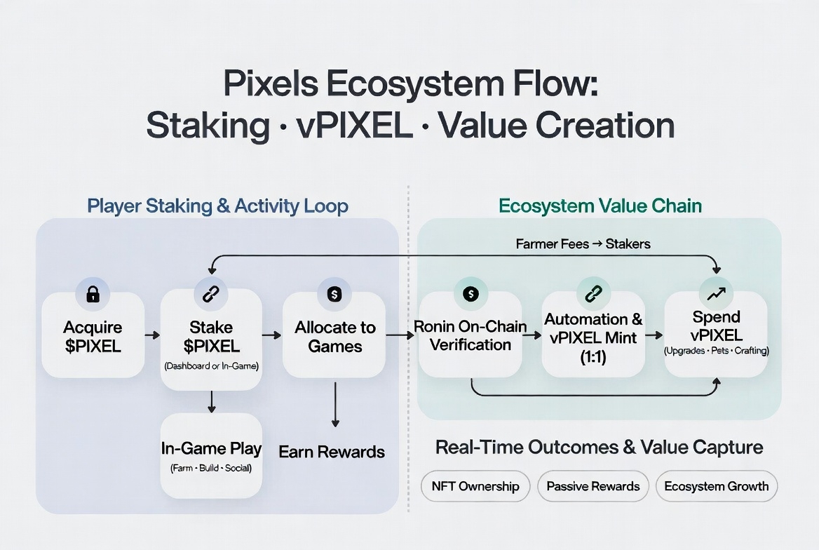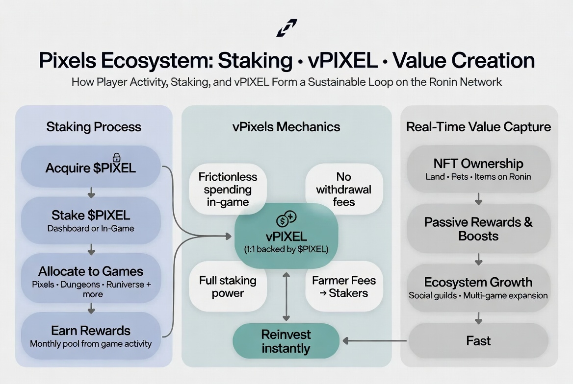 I’ve been logging into Pixels pretty regularly lately, just wandering the open world, tending my little farm plots, chatting with folks in the guilds, and experimenting with the newer features. It’s the kind of game that grows on you quietly, and one part that keeps pulling me back is how the team has woven staking, vPIXEL, and the broader ecosystem together in a way that feels designed for actual players rather than just token holders. I wanted to walk through what I’ve seen and how it all connects, because it’s honestly one of the smoother setups I’ve come across in a while.