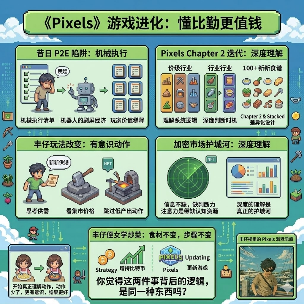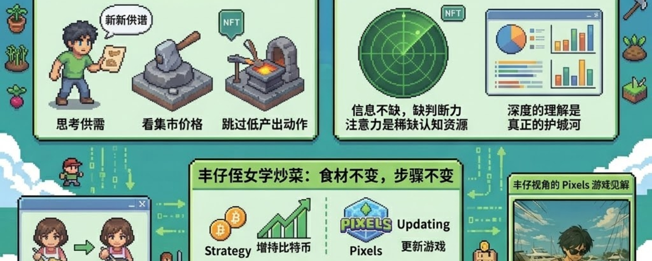 加密市场本身也是一样的逻辑。市场上从来不缺信息,缺的是对信息的判断力。注意力是真正的稀缺资源,不是资金,不是工具,不是链,而是你愿意把认知资源花在哪里、花多深。大多数人进入一个新生态系统的方式,跟刚进Pixels的新玩家一样:把所有动作都当成清单来执行,然后在第一次收益下降的时候离场。留下来的人,是那些开始读底层逻辑的人。