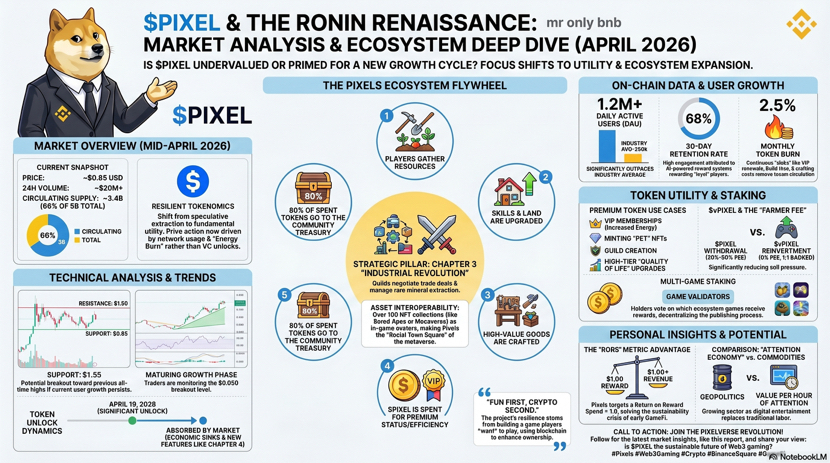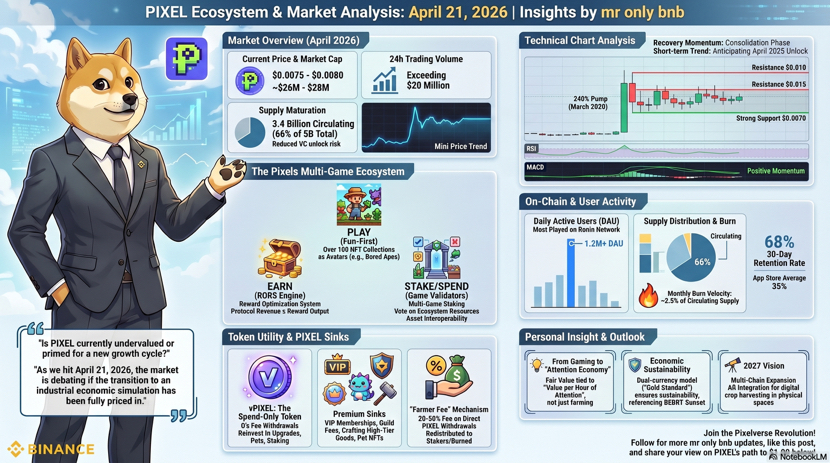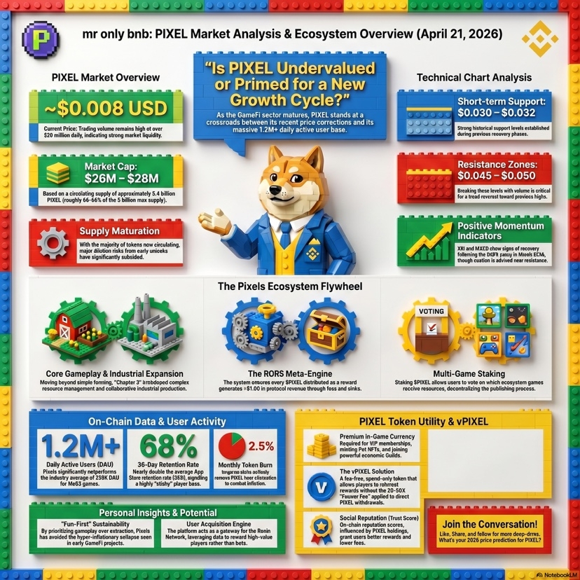 Anh em ơi, tôi là mr only bnb, và hôm nay mình không đi cà phê bằng cảm xúc, mình đi bằng chart và dữ liệu thật, vì $PIXEL là kiểu token mà nhìn qua tưởng đang nằm im như con mèo ngủ trưa, nhưng soi kỹ thì bên trong lại có cả một hệ sinh thái đang tự kéo nhau chạy marathon. Hiện tại PIXEL đang giao dịch quanh mức 0.0076364 USD, vốn hóa khoảng 25.8 triệu USD, khối lượng 24 giờ khoảng 11.8 triệu USD, nguồn cung lưu hành 3.4 tỷ trên tối đa 5 tỷ token, và vẫn còn cách rất xa đỉnh lịch sử 1.02 USD, tức là nếu nói theo ngôn ngữ trader thì đây chưa phải sân khấu của những cú FOMO đẹp như mơ, mà là giai đoạn thị trường đang test lại niềm tin của đám đông. ([Binance][1]) Theo cách tôi đọc chart, nhịp tăng 24 giờ gần nhất lên 5.6 phần trăm là tín hiệu có dòng tiền quay lại, nhưng nó giống một cú hồi kỹ thuật hơn là một cú bứt phá xác nhận xu hướng, nghĩa là phe mua đang có phản ứng tốt, còn để biến thành trend thật sự thì cần thêm thanh khoản, thêm câu chuyện và thêm sự kiên nhẫn của cộng đồng. ([Binance][1]) Tôi thích PIXEL ở chỗ nó không chỉ bán một con số trên biểu đồ, mà nó đang bán cả một thế giới chơi và sở hữu, nơi người dùng có thể chơi cùng bạn bè, trồng trọt, nuôi thú, xây thế giới riêng và kiếm phần thưởng trong một nền kinh tế gắn với staking $PIXEL. ([Pixels][2]) Nói thẳng cho vui thì nhiều token game ngoài kia sống bằng tiếng vang của một buổi ra mắt, còn Pixels thì đang cố sống bằng hệ sinh thái, mà hệ sinh thái là thứ rất khó giả vờ, vì giả được một ngày chứ không giả được nhiều tháng. Trên trang chính thức, Pixels nói rõ họ đang xây dựng một nền tảng nơi người dùng có thể tạo game tích hợp tài sản số một cách tự nhiên, có cơ chế chơi cùng bạn bè, kiếm phần thưởng và xây thế giới của riêng mình, đồng thời nhấn mạnh Pixel Economy nơi staking $PIXEL mở ra các quyền lợi và phần thưởng trong vũ trụ Pixels. ([Pixels][2]) Whitepaper của dự án còn cho thấy tầm nhìn rộng hơn một game nông trại Web3 thông thường, với ba trụ cột là Fun First, Smart Reward Targeting và Publishing Flywheel, tức là game phải vui trước đã, phần thưởng phải được phân phối thông minh, và tăng trưởng phải tạo thành một vòng lặp tự nuôi sống chính nó. ([litepaper.pixels.xyz][3]) Đây là điểm tôi đánh giá khá cao, vì trong crypto, thứ giết dự án nhiều nhất không phải là thiếu meme, mà là thiếu mô hình kinh tế có lý do để người ta quay lại mỗi ngày. Nếu nhìn từ góc độ trader, tôi thấy PIXEL hiện tại giống một cổ phiếu tăng trưởng sau pha co lại mạnh, giá đã nén đủ lâu để mọi người bắt đầu chán, và chính sự chán đó thường là mảnh đất tốt nhất cho một nhịp hồi có chiều sâu nếu hệ sinh thái tiếp tục có hoạt động thật.