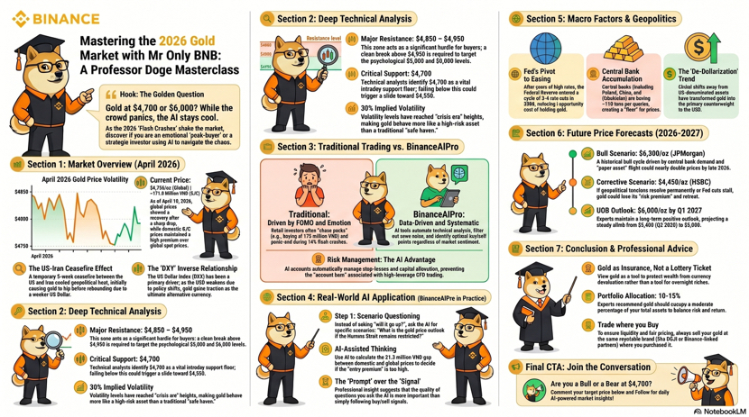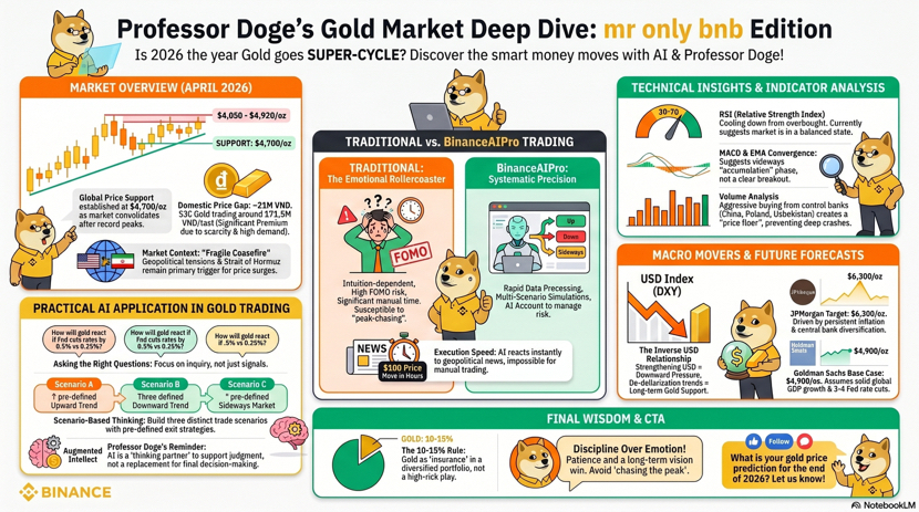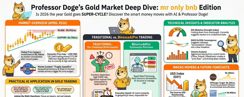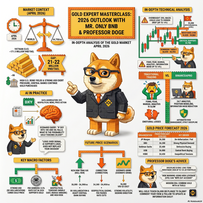 Anh em trader đâu rồi, mr only bnb lên sóng đây, sáng 21 tháng 4 năm 2026 mà nhìn chart vàng đúng kiểu thị trường đang nhắc một điều rất đơn giản nhưng nhiều người vẫn hay quên là vàng không thưởng cho ai đoán bừa, vàng chỉ thưởng cho ai đọc đúng bối cảnh. Hôm nay spot gold giảm 0.9 phần trăm xuống 4777.77 đô một ounce, futures tháng 6 về 4797.90 đô, còn vùng 4750 đến 4850 đang được nhìn như một biên dao động ngắn hạn trước khi thị trường có thêm tín hiệu rõ hơn từ câu chuyện Mỹ Iran và các dữ kiện vĩ mô sắp tới. ([Reuters][1]) Nhìn riêng về biểu đồ, tôi không xem nhịp lùi này là dấu hiệu vàng yếu đi, mà là kiểu thở lại sau một hành trình quá nóng, nhất là khi chỉ vài tháng trước kim loại quý này đã có lúc chạm mốc lịch sử trên 5181 đô và từng bước qua mốc 5000 đô lần đầu trong năm. ([Reuters][1]) Nếu giao dịch truyền thống, tôi sẽ phải mở chart, đọc tin, soi đồng đô la, ghép thêm vùng hỗ trợ kháng cự, rồi tự ép bộ não của mình không nhảy vào lệnh vì thấy cây nến dài là tim đập nhanh. Còn khi dùng BinanceAIPro, tôi thích nhất là cách nó biến việc phân tích từ cảm tính thành quy trình. Theo tài liệu chính thức của Binance, BinanceAIPro là trợ lý AI beta có thể hỗ trợ phân tích thị trường, thực thi giao dịch và giám sát tài sản, đồng thời hoạt động qua một AI Account riêng tách khỏi tài khoản chính. ([Binance][2]) Với tôi, đây là khác biệt rất lớn. Trading truyền thống buộc mình phải tự gồng toàn bộ mọi thứ, từ tin tức đến kịch bản đến việc nhắc bản thân đừng FOMO, còn BinanceAIPro giống như một trợ lý kỷ luật, nó không thay tôi quyết định nhưng nó ép tôi viết rõ luận điểm trước khi bấm nút. Cái hay của AI không nằm ở chỗ nó đoán đúng nhiều hơn tôi, mà ở chỗ nó giúp tôi hỏi câu hỏi tốt hơn. Ví dụ với $XAU, thay vì hỏi mua hay bán, tôi sẽ hỏi ba câu rất đời như là nếu đồng đô la còn mạnh thêm một nhịp thì vùng nào dễ bị quét, nếu thị trường giữ được vùng 4750 thì kịch bản hồi lên có đủ lực không, và điều kiện nào khiến tôi chỉ đứng ngoài chứ không cố làm anh hùng. Chính mấy câu hỏi đó mới là thứ cứu tài khoản, vì tài khoản chết không phải do thiếu dự báo, mà do dự báo quá tự tin. Tôi từng có giai đoạn trade theo kiểu truyền thống, tin rằng kinh nghiệm là đủ, rồi nhận ra kinh nghiệm mà không có hệ thống thì nhiều khi chỉ là sự lặp lại của những lần sai trước đó bằng một giọng nói tự tin hơn.