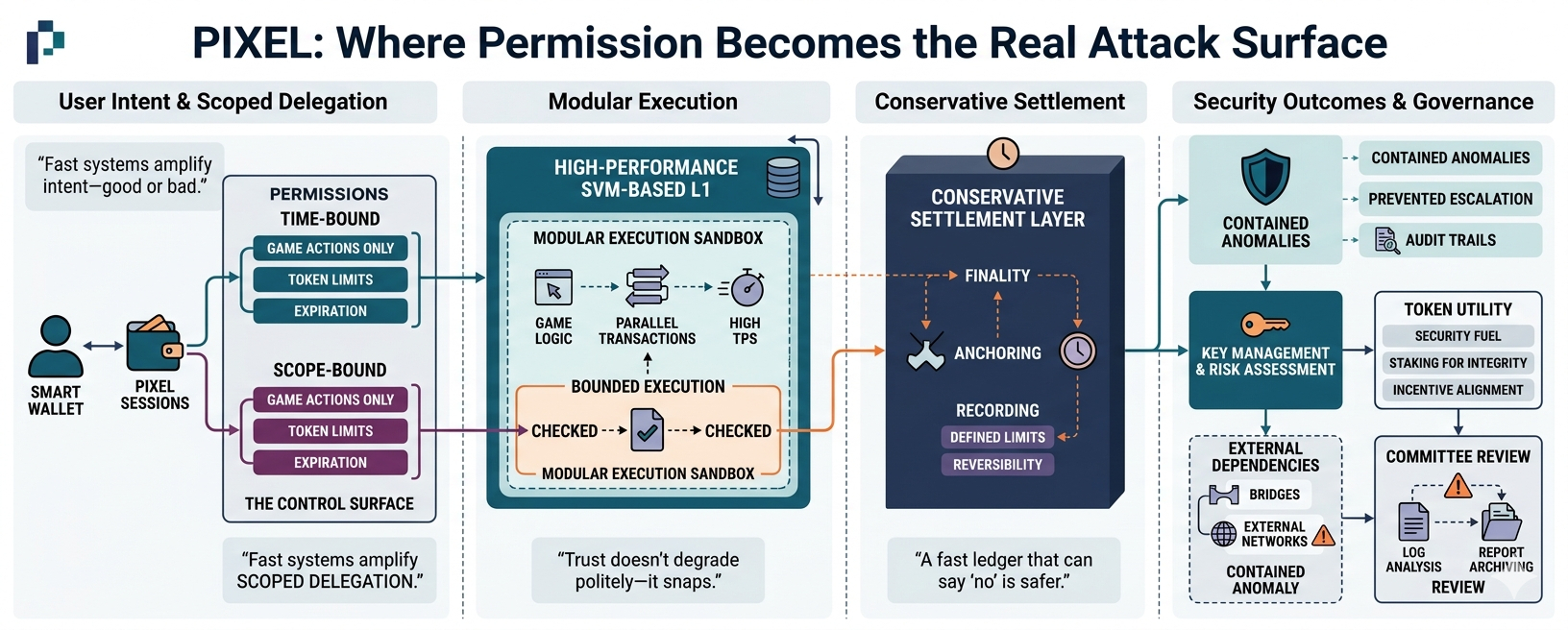 PIXEL is built differently, or at least it tries to be. it operates as a high-performance SVM-based L1, yes, but that descriptor hides the more important design choice: guardrails are not optional features, they are first-class constraints. execution is fast because it needs to be—games demand it—but execution is also bounded, scoped, and reversible within defined limits.