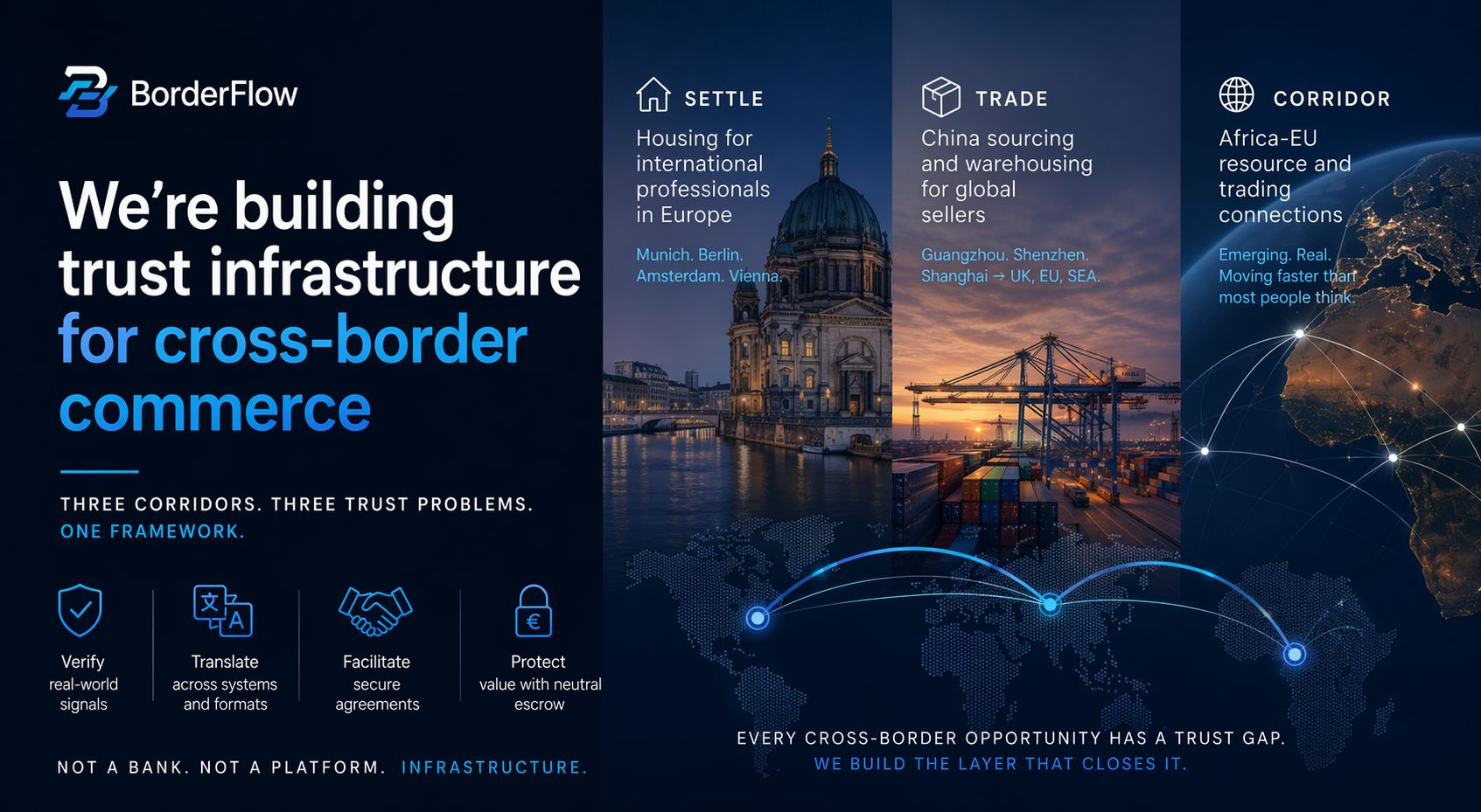 The problem: enormous commercial potential between Africa and Europe blocked by the same trust gap — no neutral infrastructure, no verified counterparties, no shared framework.